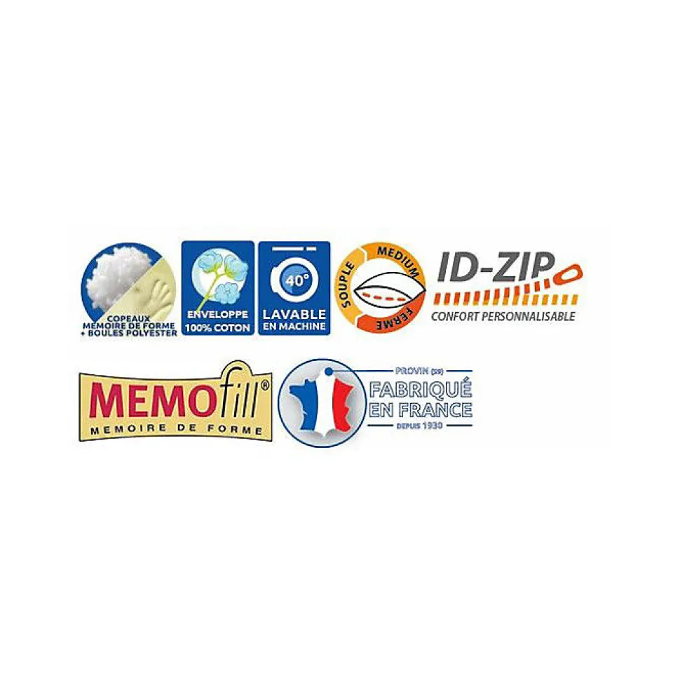 Oreiller mémoire de forme 60 x 60 cm MEMOFILL : alliage de mousse viscoélastique et boules de fibres creuses siliconées. Enveloppe 100% percale de coton, lavable en machine à 40°C, fabrication française, poids garnissage 850 g.