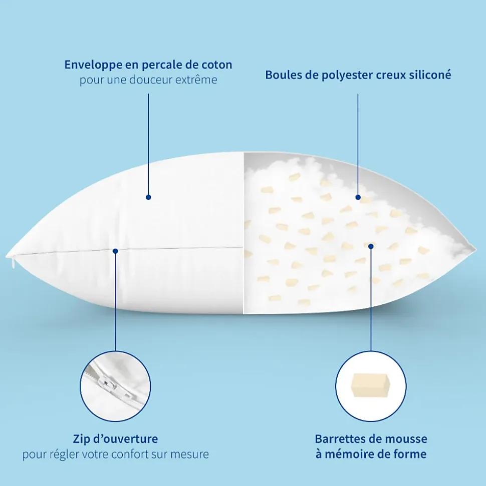 L’Oreiller Memoire de forme Mixte Anti-acariens – Enveloppe : 100% coton qualité percale- Confort Ergonomique- Traitement Anti-acariens- Fabrication française- Lavable en machine (40°)Tous les bienfaits d’une bonne nuit de sommeilL’oreiller Memoire de forme Mixte Anti-acariens bénéficie d’une technologie exclusive. Son garnissage se compose d’un mélange de mousse viscoélastique et de boules de fibres creuses siliconées indéformables. Cet alliage fluide épouse parfaitement les courbes de la nuque et de la tête, en soulageant les points d’appui. Il vous assure un soutien parfait, tout en reprenant sa forme initiale au petit matin.La protection et le confort ergonomiqueCet oreiller combine la technologie, le savoir-faire et une protection optimale, pour vous offrir un maximum de confort. Fabriqué en France, il se distingue par le soin apporté à la qualité des finitions. Son enveloppe 100% coton est pourvue d’une ouverture zippée permettant de retirer de la matière et moduler l’épaisseur de l’oreiller selon vos goûts. Elle bénefice d’un traitement naturel à base d’huiles essentielles Ce traitement antiacarien vous protège aussi des bactéries et empêche le développement des moisissures. Il résiste parfaitement aux lavages. Le coton qualité percale lui confère une douceur exceptionnelle et une aération optimale. Facile à entretenir, cet oreiller se lave en machine à 40°.Ce produit bénéficie d’un traitement biocide. Principe actif extrait géraniolProduit comportant au moins 70% de matières recycléesProduit totalement recyclable