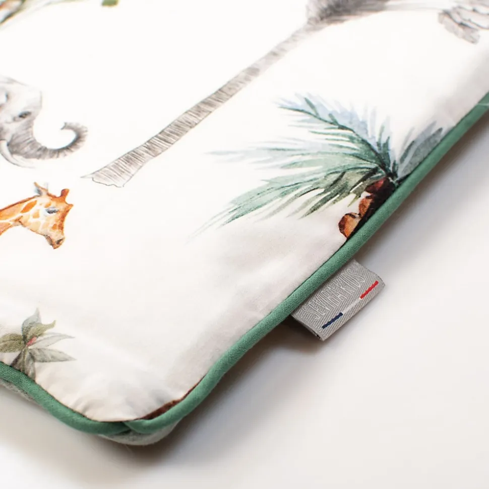 L’oreiller plat Safari, 100% made in France !Doux, léger et confortable, l’oreiller plat Safari apporte encore plus de confort à votre enfant durant ces nuits. Véritable tendance textile pour les enfants, l’oreiller prêt à dormir facilitera votre quotidien de parents, un procédé garantissant durabilité et résistance. Adapté à la morphologie des tout-petits, ce coussin est une invitation au repos tout en douceur.L’oreiller plat Safari offrira à votre enfant un sommeil optimal et confortable, essentiel pour veiller à son bon développement. Le remplissage est cousu dans la literie, pouvant donc être laver en machine sans endommager son aspect soyeux. Un véritable gain de temps pour les parents !Un joli design raffiné de la Collection Safari aux adorables imprimés animaliers et de palmiers pour de belles aventures à l’esprit jungle. Fabriqué avec passion dans notre atelier en France, réalisé minutieusement à la main par notre équipe.Pour en savoir un peu plus sur l’oreiller plat Jeanne en gaze de coton, 100% made in France :• Un linge de lit facile au quotidien, léger, confortable et nomade : emporter votre oreillerpartout où vous le souhaitez.• Une face en coton certifié et une face en gaze de coton / Garnissage en fibres creuses siliconnées certifiées 100%• Circuit court : conception et fabrication dans les ateliers Sevira Kids en France, à Compiègne