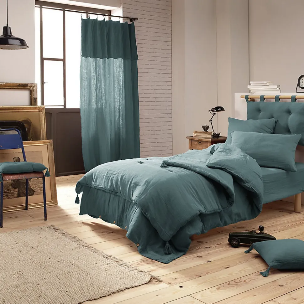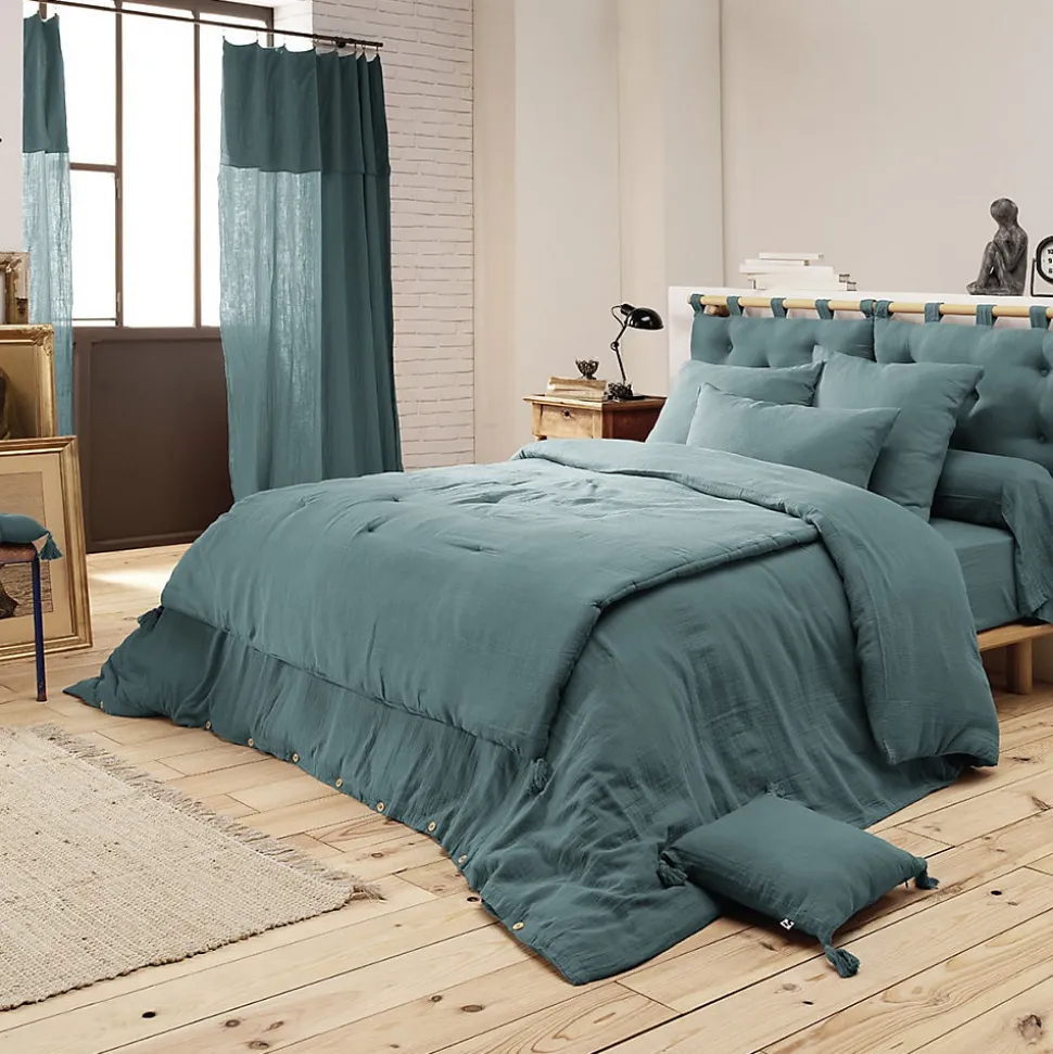 Couvre-pied 150x150cm Capitonné Gaze de Coton Canard Ourea.Un indémodable pour prévenir le froid et habiller élégamment votre lit… mais aussi vos banquettes et canapés ! Une conception en double gaze de coton, légère, fluide et confortable. Une matière qui gagne en souplesse et en douceur au fil des lavages. ment froissée : pas besoin de repasser !Fabrication 100% Coton, densité 125g/m2. Garnissage 100% Polyester, densité 300 g/m2. Capitonnage léger. Finition avec pompon aux 4 coins. Produit certifié OEKO-TEX.Dimensions : 150x150cm.Entretien facile : Lavage à 30°C avec couleurs similaires. Pas de sèche-linge.Salon, Art de la table, Chambre : la gamme de linge de maison Ourea a des solutions pour tout !