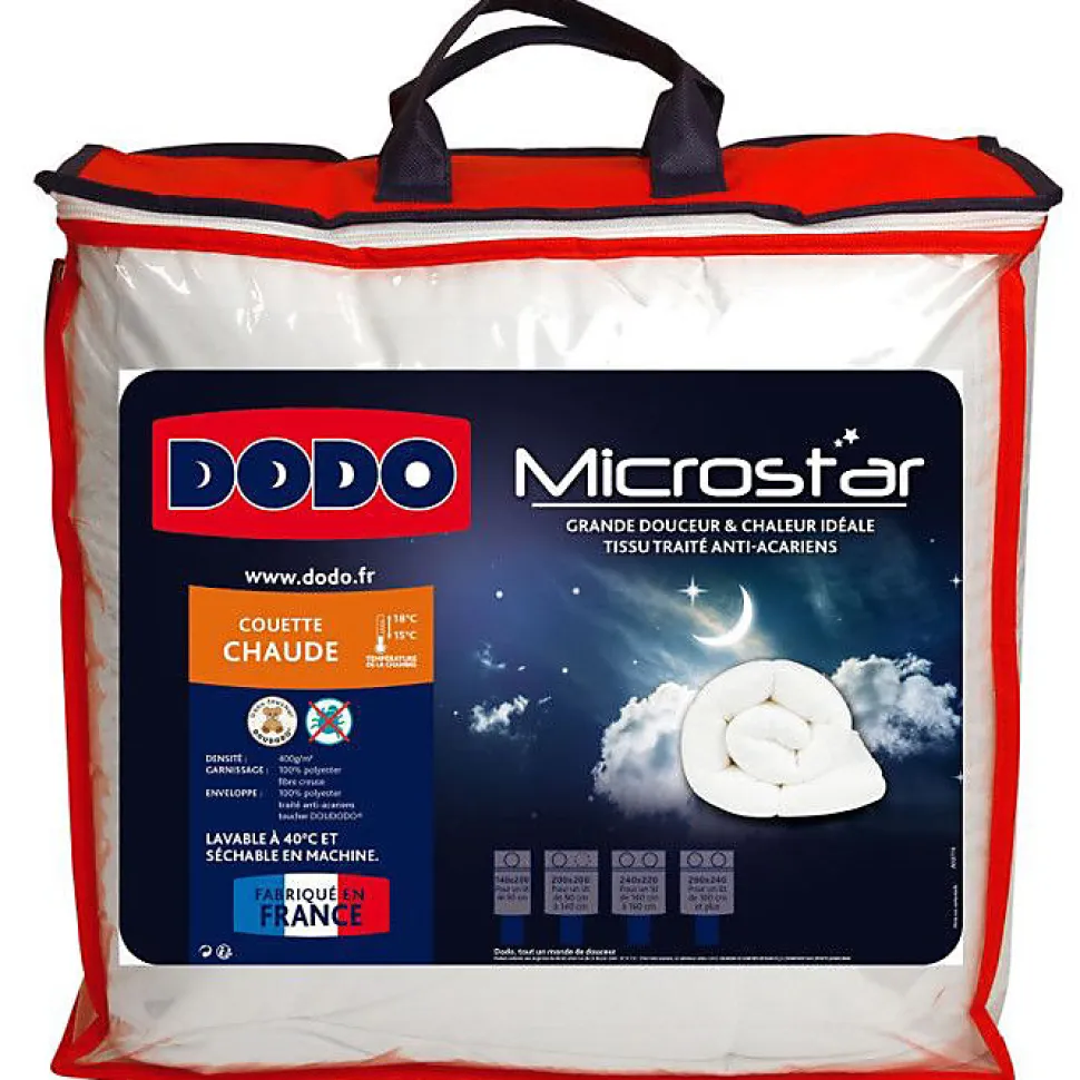 Pack Anti-Acariens composé de : 1 Couette Dodo Microstar 220 x 240 cm pour lit 2 places + 2 Oreillers Microstar 60 x 60 cm + 2 Oreillers Microstar 50 x 70 cm Toucher DOUDODO Descriptif de la couette : Cette couette a été conçue pour répondre aux besoins de Confort et de Bien Etre de tous. Elle allie Confort et Praticité d’usage . DIMENSIONS: 220 x 240 cm Pour lit pour lit 140 x 190 cm à 160 x 200 cm. Produit de qualité avec une enveloppe de qualité 100% polyester et un garnissage de 400 g/m², en fibre polyester cardée utilisant une technologie de pointe . Les fines fibres de garnissage sont creuses pour une meilleure circulation de l’air et siliconées pour apporter un confort optimum. La qualité de ce garnissage assure une durée de vie du produit plus longue. Facile d’entretien, votre couette peut être lavée en machine à 40° puis séchée en machine à température modérée. Descriptif des oreillers : Oreiller microstar Médium Anti-Acariens « DODO » confectionné dans un Tissu Ultra Doux , Toucher DOUDODO. Traité Anti-Acariens et avec une Fibre de Garnissage 100% Polyester, Creuse, permettant une bonne Circulation de l’Air. Oreiller fabriqué en France , il est tout simplement Doux et Confortable à la Fois. Il vous permettra également de dormir dans un Environnement plus Sain, grâce à son Traitement Anti-Acariens . L’oreiller Microstar est un produit de qualité qui vous protège des acariens pour des nuits plus saines, il est ainsi idéal pour les personnes sujettes aux allergies. Cet article traité antiacarien contient un produit biocide. Son garnissage convient à la majorité des dormeurs . Les points forts de ce produit: La qualité DODO La garantie DODO Garnissage en fibres creuses siliconées Résistant aux lavages Entretien facile Fabriqué en France Toucher DOUDODO UNE PRODUCTION ET UN SAVOIR FAIRE FRANÇAIS DODO est le leader européen des couettes et des oreillers. Depuis 70 ans la marque est animée de la même passion : « mettre à votre disposition les meilleurs instrumen