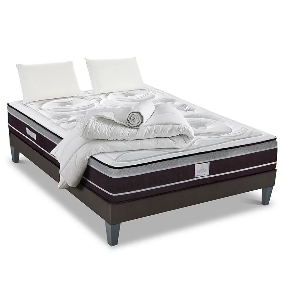 MatelasCARACTERISTIQUES :Dimensions disponibles (cm) : 90×190 – 90×200 – 140×190 – 140×200 – 160×200 – 180x200Epaisseur : 28 cmTechnologie : Ressorts ensachés et Mémoire de formeAccueil : EquilibréSoutien : FermeIndépendance de couchage : 4/5Aération : 5/5Fabrication : EspagneDéhoussable : NonGarantie : 10 ansLivré compressé rouléCOMPOSITION :Âme intérieure (CertiPUR) : 527 ressorts ensachés + 4 cm de mousse viscoélastique à mémoire de forme de 60 kg/m³ + 1,5 cm de mousse hypersoft + 1 cm de mousse de confort + 100 gr/m² de fibres PESCoutil (Oeko-Tex) : Tissu stretch de 275 gr/m²POINTS FORTS :ErgonomieIndépendance de couchageSoutienHygièneSommierCARACTERISTIQUES :Dimensions disponibles (cm) : 90×190 – 90×200 – 140×190 – 140×200 – 160×200 – 180x200Suspension : Tri-lattesHauteur (avec pieds) : 30 cmNombre de pieds : 4Nombre de lattes : 24Matière : BoisCouleur revêtement : GrisGarantie : 5 ansLivré en kitPOINTS FORTS :Finitions soignéesRobustesseTransport et montage facilesIntégrable dans un cadre de litAccessoires inclus1 Oreiller mémoire de forme 40×60 cm1 Couette synthétique thermo-isolante1 Protège matelas absorbant