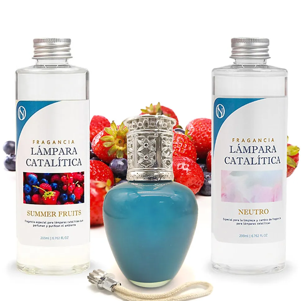 ❗ Pack économique Lampe Catalytique Aqua Marina + Parfum Summer Fruits 200 ml + Nettoyant Neutre 200 ml + Mèche de Rechange ❗Une lampe catalytique parfume et purifie l’air et élimine les odeurs tenaces telles que celles du tabac, de la cuisine, de l’humidité, des animaux domestiques, etc. Le système de désodorisant à lampe catalytique crée non seulement un environnement parfumé, mais améliore également la qualité de l’air et embellit la pièce d’un design élégant. En seulement 20 à 30 minutes d’utilisation, la pièce sera parfumée pendant 2 heures. Lorsqu’elle est allumée, la pierre chauffe et génère une catalyse, qui décompose les particules odorantes et purifie l’environnement.⁉️ Comment utiliser une lampe catalytique ?1. REMPLIR LA LAMPE DE PARFUM : Retirez le bouchon décoratif et le capuchon et remplissez la lampe aux 3/4 avec le parfum choisi.2. PLACER LA MÈCHE DANS LA LAMPE : Insérez la mèche éteinte dans la lampe et laissez-la imprégner de parfum pendant environ 15 minutes.3. ALLUMER LA MÈCHE : À l’aide d’un briquet ou d’allumettes, allumez la mèche et laissez la flamme allumée pendant 2 minutes, jusqu’à ce qu’elle se réduise.4. ÉTEINDRE LE BRÛLEUR EN SOUFFLANT : Une fois la flamme réduite, soufflez pour l’éteindre complètement et remettez le capuchon décoratif.5. FIXER LA TÊTE DÉCORATIVE : Une fois la flamme éteinte, placez la tête décorative (avec les trous) sur la lampe à catalyse pour diffuser le parfum. Il est recommandé de l’utiliser pendant 20 à 30 minutes.6. ÉTEINDRE LA LAMPE CATALYTIQUE : Pour éteindre complètement la lampe catalytique, retirez le capuchon décoratif et remettez le capuchon métallique fermé, ce qui arrête la combustion.