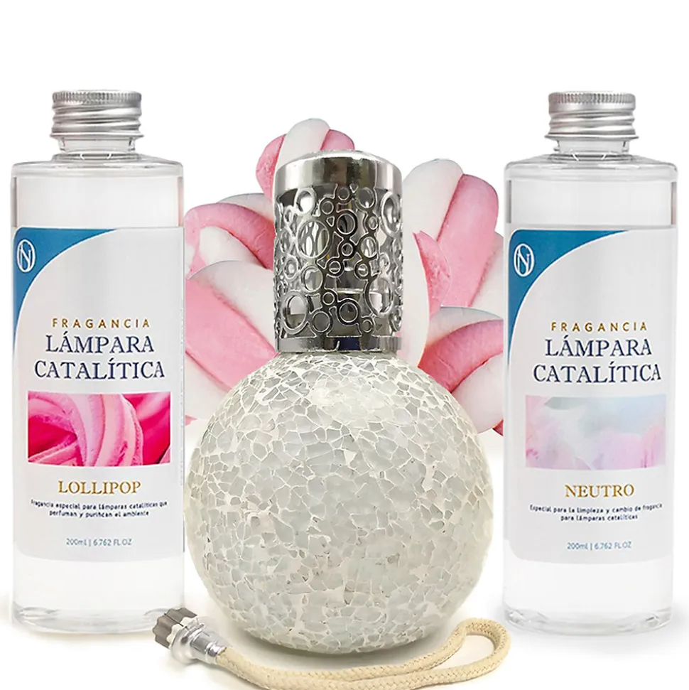❗ Pack économique Lampe Catalytique Mosaïque Blanc + Parfum Lollipop 500 ml + Nettoyant Neutre 200 ml + Mèche de Rechange ❗Une lampe catalytique parfume et purifie l’air et élimine les odeurs tenaces telles que celles du tabac, de la cuisine, de l’humidité, des animaux domestiques, etc. Le système de désodorisant à lampe catalytique crée non seulement un environnement parfumé, mais améliore également la qualité de l’air et embellit la pièce d’un design élégant. En seulement 20 à 30 minutes d’utilisation, la pièce sera parfumée pendant 2 heures. Lorsqu’elle est allumée, la pierre chauffe et génère une catalyse, qui décompose les particules odorantes et purifie l’environnement.⁉️ Comment utiliser une lampe catalytique ?1. REMPLIR LA LAMPE DE PARFUM : Retirez le bouchon décoratif et le capuchon et remplissez la lampe aux 3/4 avec le parfum choisi.2. PLACER LA MÈCHE DANS LA LAMPE : Insérez la mèche éteinte dans la lampe et laissez-la imprégner de parfum pendant environ 15 minutes.3. ALLUMER LA MÈCHE : À l’aide d’un briquet ou d’allumettes, allumez la mèche et laissez la flamme allumée pendant 2 minutes, jusqu’à ce qu’elle se réduise.4. ÉTEINDRE LE BRÛLEUR EN SOUFFLANT : Une fois la flamme réduite, soufflez pour l’éteindre complètement et remettez le capuchon décoratif.5. FIXER LA TÊTE DÉCORATIVE : Une fois la flamme éteinte, placez la tête décorative (avec les trous) sur la lampe à catalyse pour diffuser le parfum. Il est recommandé de l’utiliser pendant 20 à 30 minutes.6. ÉTEINDRE LA LAMPE CATALYTIQUE : Pour éteindre complètement la lampe catalytique, retirez le capuchon décoratif et remettez le capuchon métallique fermé, ce qui arrête la combustion.