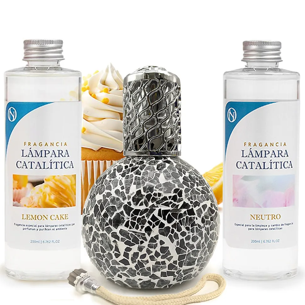 ❗ Pack économique Lampe Catalytique Mosaïque Noir + Parfum Lemon Cake 200 ml + Nettoyant Neutre 200 ml + Mèche de Rechange ❗Une lampe catalytique parfume et purifie l’air et élimine les odeurs tenaces telles que celles du tabac, de la cuisine, de l’humidité, des animaux domestiques, etc. Le système de désodorisant à lampe catalytique crée non seulement un environnement parfumé, mais améliore également la qualité de l’air et embellit la pièce d’un design élégant. En seulement 20 à 30 minutes d’utilisation, la pièce sera parfumée pendant 2 heures. Lorsqu’elle est allumée, la pierre chauffe et génère une catalyse, qui décompose les particules odorantes et purifie l’environnement.⁉️ Comment utiliser une lampe catalytique ?1. REMPLIR LA LAMPE DE PARFUM : Retirez le bouchon décoratif et le capuchon et remplissez la lampe aux 3/4 avec le parfum choisi.2. PLACER LA MÈCHE DANS LA LAMPE : Insérez la mèche éteinte dans la lampe et laissez-la imprégner de parfum pendant environ 15 minutes.3. ALLUMER LA MÈCHE : À l’aide d’un briquet ou d’allumettes, allumez la mèche et laissez la flamme allumée pendant 2 minutes, jusqu’à ce qu’elle se réduise.4. ÉTEINDRE LE BRÛLEUR EN SOUFFLANT : Une fois la flamme réduite, soufflez pour l’éteindre complètement et remettez le capuchon décoratif.5. FIXER LA TÊTE DÉCORATIVE : Une fois la flamme éteinte, placez la tête décorative (avec les trous) sur la lampe à catalyse pour diffuser le parfum. Il est recommandé de l’utiliser pendant 20 à 30 minutes.6. ÉTEINDRE LA LAMPE CATALYTIQUE : Pour éteindre complètement la lampe catalytique, retirez le capuchon décoratif et remettez le capuchon métallique fermé, ce qui arrête la combustion.