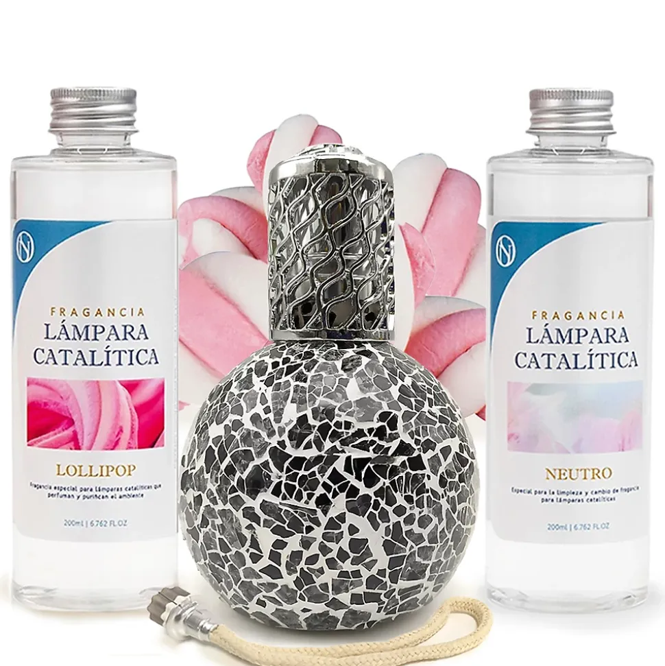 ❗ Pack économique Lampe Catalytique Mosaïque Noir + Parfum Lollipop 200 ml + Nettoyant Neutre 200 ml + Mèche de Rechange ❗Une lampe catalytique parfume et purifie l’air et élimine les odeurs tenaces telles que celles du tabac, de la cuisine, de l’humidité, des animaux domestiques, etc. Le système de désodorisant à lampe catalytique crée non seulement un environnement parfumé, mais améliore également la qualité de l’air et embellit la pièce d’un design élégant. En seulement 20 à 30 minutes d’utilisation, la pièce sera parfumée pendant 2 heures. Lorsqu’elle est allumée, la pierre chauffe et génère une catalyse, qui décompose les particules odorantes et purifie l’environnement.⁉️ Comment utiliser une lampe catalytique ?1. REMPLIR LA LAMPE DE PARFUM : Retirez le bouchon décoratif et le capuchon et remplissez la lampe aux 3/4 avec le parfum choisi.2. PLACER LA MÈCHE DANS LA LAMPE : Insérez la mèche éteinte dans la lampe et laissez-la imprégner de parfum pendant environ 15 minutes.3. ALLUMER LA MÈCHE : À l’aide d’un briquet ou d’allumettes, allumez la mèche et laissez la flamme allumée pendant 2 minutes, jusqu’à ce qu’elle se réduise.4. ÉTEINDRE LE BRÛLEUR EN SOUFFLANT : Une fois la flamme réduite, soufflez pour l’éteindre complètement et remettez le capuchon décoratif.5. FIXER LA TÊTE DÉCORATIVE : Une fois la flamme éteinte, placez la tête décorative (avec les trous) sur la lampe à catalyse pour diffuser le parfum. Il est recommandé de l’utiliser pendant 20 à 30 minutes.6. ÉTEINDRE LA LAMPE CATALYTIQUE : Pour éteindre complètement la lampe catalytique, retirez le capuchon décoratif et remettez le capuchon métallique fermé, ce qui arrête la combustion.