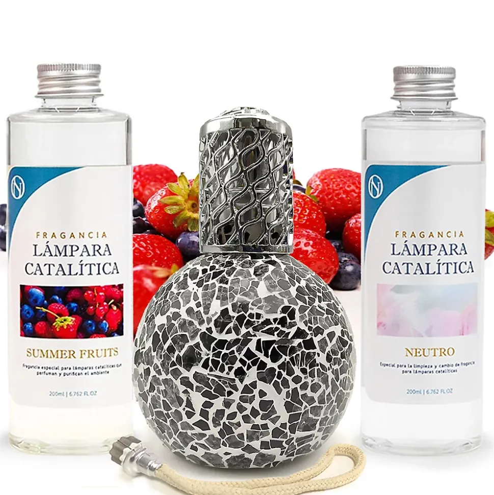 ❗ Pack économique Lampe Catalytique Mosaïque Noir + Parfum Summer Fruits 200 ml + Nettoyant Neutre 200 ml + Mèche de Rechange ❗Une lampe catalytique parfume et purifie l’air et élimine les odeurs tenaces telles que celles du tabac, de la cuisine, de l’humidité, des animaux domestiques, etc. Le système de désodorisant à lampe catalytique crée non seulement un environnement parfumé, mais améliore également la qualité de l’air et embellit la pièce d’un design élégant. En seulement 20 à 30 minutes d’utilisation, la pièce sera parfumée pendant 2 heures. Lorsqu’elle est allumée, la pierre chauffe et génère une catalyse, qui décompose les particules odorantes et purifie l’environnement.⁉️ Comment utiliser une lampe catalytique ?1. REMPLIR LA LAMPE DE PARFUM : Retirez le bouchon décoratif et le capuchon et remplissez la lampe aux 3/4 avec le parfum choisi.2. PLACER LA MÈCHE DANS LA LAMPE : Insérez la mèche éteinte dans la lampe et laissez-la imprégner de parfum pendant environ 15 minutes.3. ALLUMER LA MÈCHE : À l’aide d’un briquet ou d’allumettes, allumez la mèche et laissez la flamme allumée pendant 2 minutes, jusqu’à ce qu’elle se réduise.4. ÉTEINDRE LE BRÛLEUR EN SOUFFLANT : Une fois la flamme réduite, soufflez pour l’éteindre complètement et remettez le capuchon décoratif.5. FIXER LA TÊTE DÉCORATIVE : Une fois la flamme éteinte, placez la tête décorative (avec les trous) sur la lampe à catalyse pour diffuser le parfum. Il est recommandé de l’utiliser pendant 20 à 30 minutes.6. ÉTEINDRE LA LAMPE CATALYTIQUE : Pour éteindre complètement la lampe catalytique, retirez le capuchon décoratif et remettez le capuchon métallique fermé, ce qui arrête la combustion.