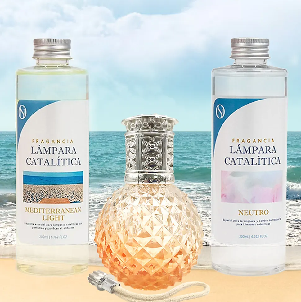 ❗ Pack économique Lampe Catalytique Orange Diamonds + Parfum Mediterranean Light 200 ml + Nettoyant Neutre 200 ml + Mèche de Rechange ❗Une lampe catalytique parfume et purifie l’air et élimine les odeurs tenaces telles que celles du tabac, de la cuisine, de l’humidité, des animaux domestiques, etc. Le système de désodorisant à lampe catalytique crée non seulement un environnement parfumé, mais améliore également la qualité de l’air et embellit la pièce d’un design élégant. En seulement 20 à 30 minutes d’utilisation, la pièce sera parfumée pendant 2 heures. Lorsqu’elle est allumée, la pierre chauffe et génère une catalyse, qui décompose les particules odorantes et purifie l’environnement.⁉️ Comment utiliser une lampe catalytique ?1. REMPLIR LA LAMPE DE PARFUM : Retirez le bouchon décoratif et le capuchon et remplissez la lampe aux 3/4 avec le parfum choisi.2. PLACER LA MÈCHE DANS LA LAMPE : Insérez la mèche éteinte dans la lampe et laissez-la imprégner de parfum pendant environ 15 minutes.3. ALLUMER LA MÈCHE : À l’aide d’un briquet ou d’allumettes, allumez la mèche et laissez la flamme allumée pendant 2 minutes, jusqu’à ce qu’elle se réduise.4. ÉTEINDRE LE BRÛLEUR EN SOUFFLANT : Une fois la flamme réduite, soufflez pour l’éteindre complètement et remettez le capuchon décoratif.5. FIXER LA TÊTE DÉCORATIVE : Une fois la flamme éteinte, placez la tête décorative (avec les trous) sur la lampe à catalyse pour diffuser le parfum. Il est recommandé de l’utiliser pendant 20 à 30 minutes.6. ÉTEINDRE LA LAMPE CATALYTIQUE : Pour éteindre complètement la lampe catalytique, retirez le capuchon décoratif et remettez le capuchon métallique fermé, ce qui arrête la combustion.