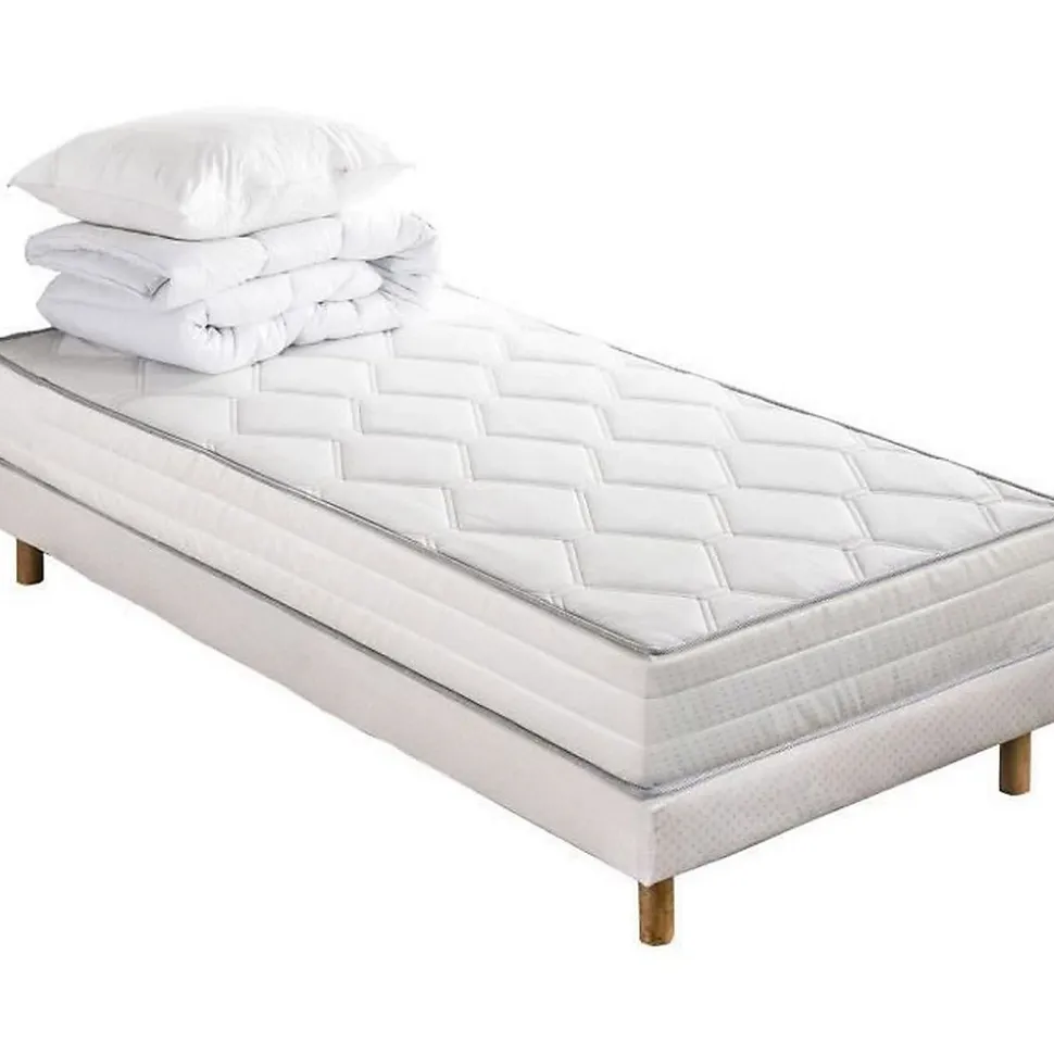 - Pack complet prêt à l’emploi comprenant matelas 90 x 190 cm, sommier tapissier, couette 140 x 200 et oreiller 60 x 60 pour une installation immédiate.