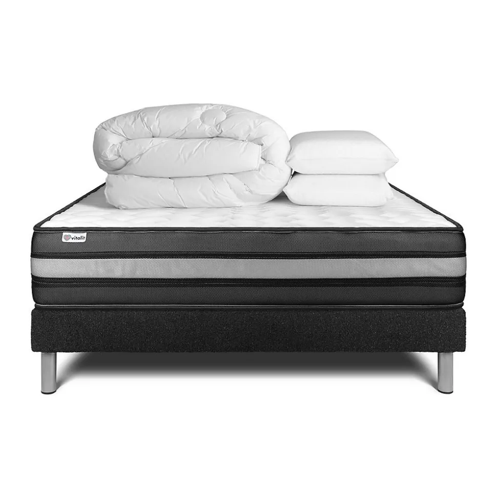 Faites le plein d’énergie positive grâce aux solutions de literie énergisantes Vitalit qui allient confort, maintien et souplesse et permettre à votre corps de prendre le temps de se revitaliser. Les matelas et sommiers Vitalit sont pensés pour s’adapter aux spécificités corporelles et au sommeil de chacun. De fabrication portugaise, les produits Vitalit sont rigoureusement élaborés selon des cahiers des charges précis. Jusqu’à la livraison, notre objectif : votre satisfaction.Découvrez le VITALPOWER ZEN, un matelas de 24 cm d’épaisseur qui utilise la puissance de la mousse à mémoire de forme. Avec sa tenue ferme, il épouse délicatement les contours de votre corps, offrant un accueil enveloppant et réduisant les points de pression. Grâce à son coutil micro perforé, ce matelas assure une circulation d’air optimisée, favorisant une aération maximale. Détendez-vous avec le VITALPOWER ZEN, le matelas qui allie confort, soutien et sérénité.Type de matelas : Mémoire de formeEpaisseur : 24 cmÂme 100% mousse polyuréthane Haute Densité 20 cmMousse polyuréthane à mémoire de forme D 55 kg + Mousse polyuréthane Soft HDMousse Polyuréthane Hypersoft ultraconfortFibres 100% Polyester 350G/M2Coutil 100% polyester microperforé ultra-respirablePlate-Bande 3D micro-aérée 100% Polyester pour optimiser l’aération du matelasConfort : Ferme – Accueil enveloppant – Soutien fermeSommierSommier Tapissier à lattes en kit à assembler soi mêmeNombre de lattes : 2 x 15 lattes multiplisStructure et traverses de renfort en pin massifTissu Maille 100% polyester 855G/M2 respirable et résistant certifié OEKO-TEX Standard 100Hauteur 14cm + Pieds acier 15cm (fournis)Adapté pour tous types de matelasMontage facile par une personne seule en moins de 15 minOREILLERS2 x Oreillers mémoire de forme 60 x 40 cmMousse polyuré