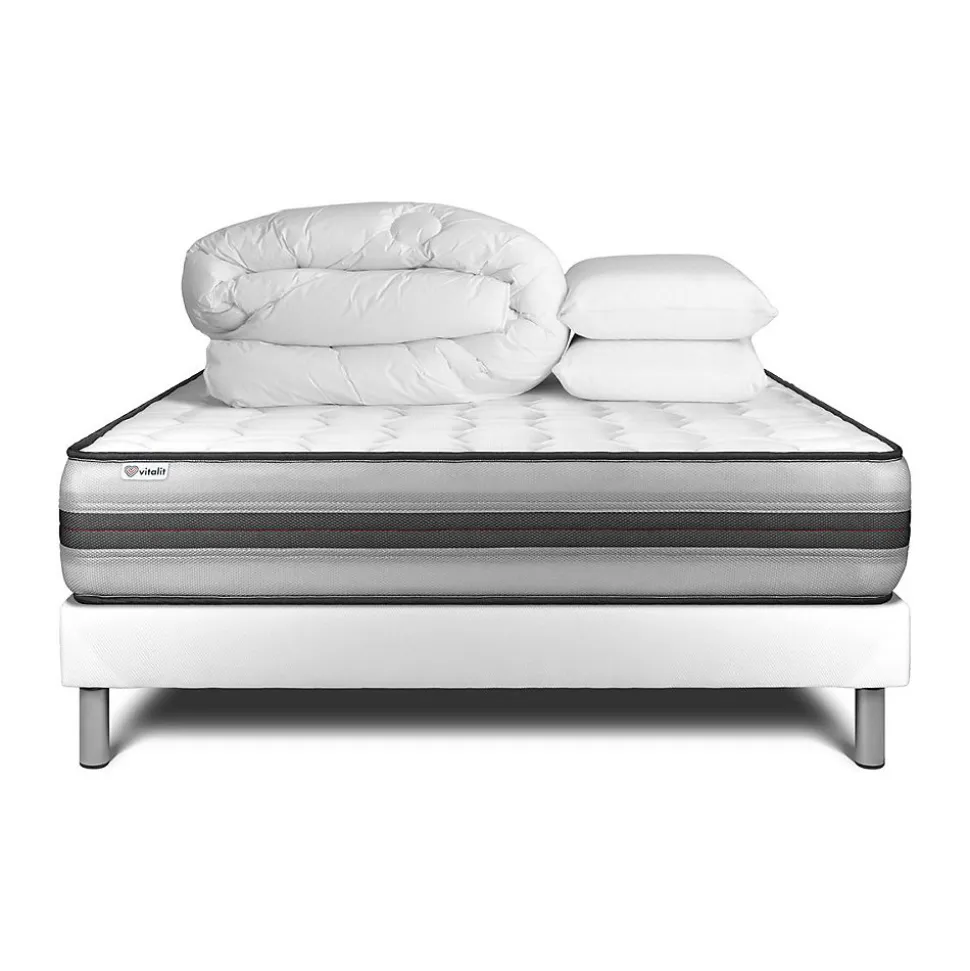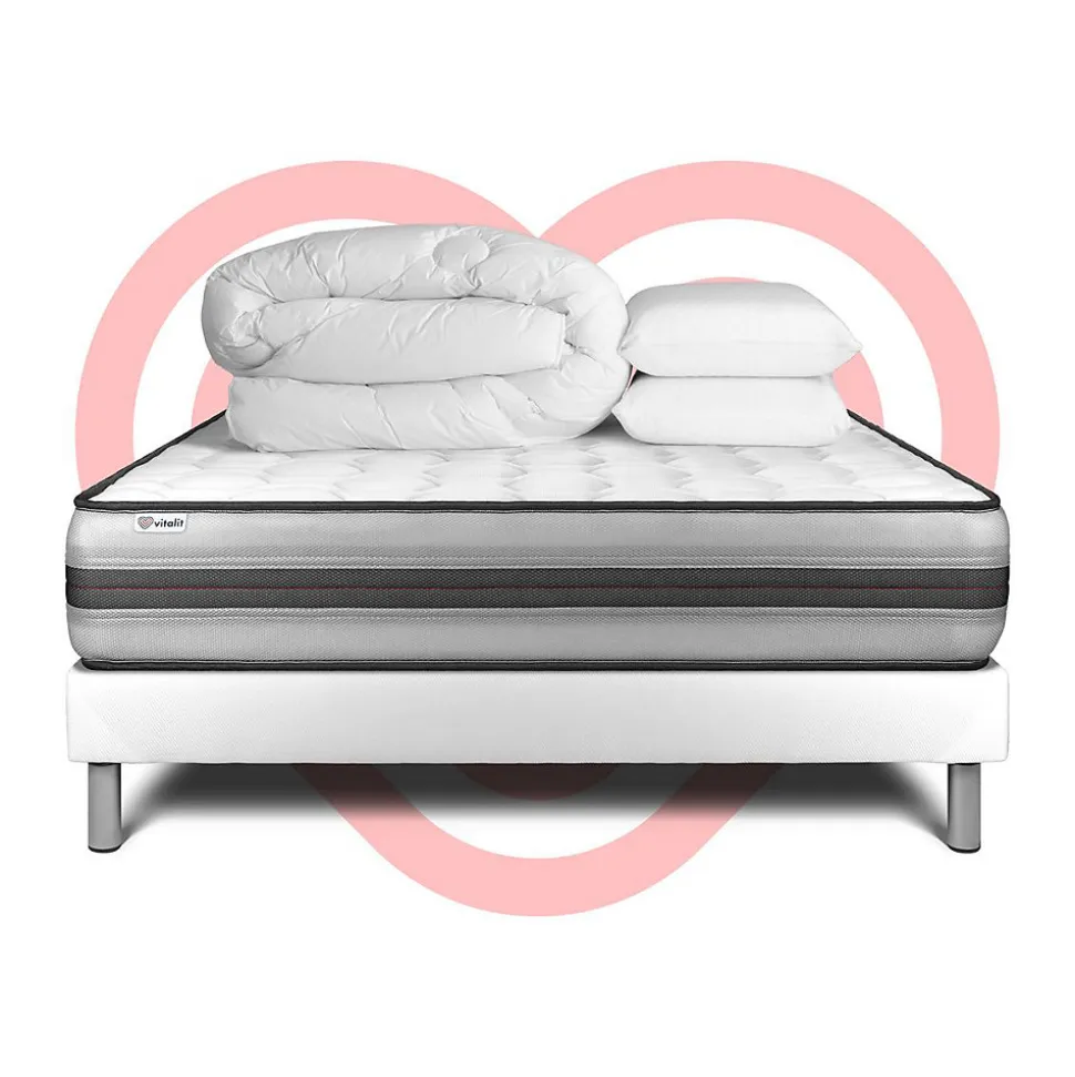 Faites le plein d’énergie positive grâce aux solutions de literie énergisantes Vitalit qui allient confort, maintien et souplesse et permettre à votre corps de prendre le temps de se revitaliser. Les matelas et sommiers Vitalit sont pensés pour s’adapter aux spécificités corporelles et au sommeil de chacun. De fabrication portugaise, les produits Vitalit sont rigoureusement élaborés selon des cahiers des charges précis. Jusqu’à la livraison, notre objectif : votre satisfaction.Avec ses 26 cm d’épaisseur, le matelas hybride haut de gamme VITALPOWER RECOVER bénéficie de l’alliance technologique des ressorts ensachés et mousse à mémoire de forme. D’un soutien ferme, son accueil enveloppant s’adapte à votre morphologie et allège les points de pression. Son coutil micro perforé garantie une aération optimisée. Recharger vos batteries durant votre sommeil avec le matelas VITALPOWER RECOVER.Type de matelas : Mémoire de forme et ressorts ensachésEpaisseur : 26 cmMicro perforé ultra-respirableCarénage mousse polyuréthane 30kgMousse polyuréthane à mémoire de forme D 55 kg + Mousse polyuréthane Soft HDFibres 100% Polyester 350G/M2Nombre de ressorts ensachés : 961 pour le 200x200cmPlate-Bande 3D micro-aérée 100% Polyester pour optimiser l’aération du matelasCoutil micro perforé ultra respirable 100% PolyesterConfort : Equilibré – Accueil moelleux – Soutien fermeFace de couchage : Face été / Face hiverDensité : 55 kg/m3Certification : Oeko-TexSommierSommier Tapissier à lattes en kit à assembler soi mêmeNombre de lattes : 2 x 16 lattes multiplisStructure et traverses de renfort en pin massifTissu Maille 100% polyester 260 G/M2 respirableHauteur 14cm + Pieds acier 15cm (fournis)Adapté pour tous types de matelasMontage facile par une personne seule en moins de 15 minOREILLERS</l