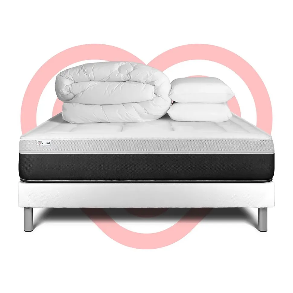 Faites le plein d’énergie positive grâce aux solutions de literie énergisantes Vitalit qui allient confort, maintien et souplesse et permettre à votre corps de prendre le temps de se revitaliser. Les matelas et sommiers Vitalit sont pensés pour s’adapter aux spécificités corporelles et au sommeil de chacun. De fabrication portugaise, les produits Vitalit sont rigoureusement élaborés selon des cahiers des charges précis. Jusqu’à la livraison, notre objectif : votre satisfaction.Découvrez notre modèle hybride VITAL FORM, un matelas de 22 cm d’épaisseur conçu pour vous offrir un soutien ferme et un accueil tonique ! Il associe la technologie des ressorts ensachés à la mousse à mémoire de forme et Hypersoft pour une expérience de sommeil exceptionnelle. Ses 5 zones de confort s’adaptent à votre morphologie et permettent un alignement optimal de votre colonne vertébrale. Réveillez-vous en forme chaque matin avec notre matelas VITAL FORM !Epaisseur 22 cmÂme ressorts ensachés 17 cmCarénage mousse polyuréthane 30kgMousse polyuréthane à mémoire de forme D 55 kg + Mousse polyuréthane Soft HDFibres 100% Polyester 350G/M2Nombre de ressorts ensachés : 651 pour le 140x200cmPlate-Bande 3D micro-aérée 100% Polyester pour optimiser l’aération du matelasCoutil micro perforé ultra respirable 100% PolyesterConfort : FermeAccueil dynamiqueSoutien ferme5 zones de confortSommierSommier Tapissier à lattes en kit à assembler soi mêmeNombre de lattes : 2 x 16 lattes multiplisStructure et traverses de renfort en pin massifTissu Maille 100% polyester 260 G/M2 respirableHauteur 14cm + Pieds acier 15cm (fournis)Adapté pour tous types de matelasMontage facile par une personne seule en moins de 15 minOREILLERS2 x Oreillers mémoire de forme 60 x 40 cmMousse polyuréthane à mémoire <