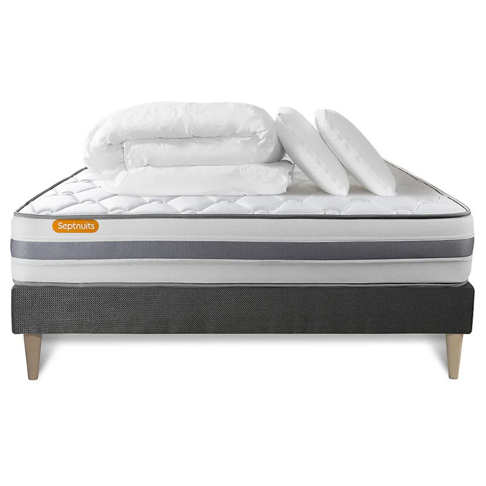 Le matelas Memo Spring de la marque Septnuits est constitué d’une âme en ressorts ensachés procurant un soutien très précis point par point avec 3 zones différenciées. Sa conception unique vous offrira un soutien ferme et un accueil dynamique. Sa Plate-bande 3D micro aérée, associée à son coutil micro perforé ultra respirable et sa fibre polyester vous garantissent une ventilation active du matelas. Sa maxi épaisseur vous assure une nuit de bien-être. Son plus ses ressorts ensachés pour une parfaite indépendance de couchage.- Type de matelas : Mémoire de forme- Epaisseur : 22 cm- Confort : ferme- Accueil : Ferme avec 2,5 cm de mousse polyuréthane à mémoire de forme D55kg + 2 cm mousse polyuréthane Hypersoft + Fibres 100% Polyester 350G/M2- Soutien : Ame 744 Ressorts ensachés- Indépendance de couchage : Très bonne- Coutil : Tissu 100% polyester Micro perforé ultra-respirable- Bande latérale : Tissu 100% polyester Micro perforé ultra-respirable- Face de couchage : Réversible- Densité : 55 kg/m3- Certification : Label Oeko-Tex Standard 100- Nos matières premières sont certifiées par le label textile OEKO-TEX- Sommier tapissier à assembler soi même- Nombre de lattes : 2×15 lattes multiplis- Structure et traverses de renfort en pin massif- Garnissage fibres 100% Polyester 120G/M2- Tissu Maille 100% polyester 260 G/M2- Hauteur 14cm + Pieds bois en pin naturel 15cm- Oreiller mémoire de forme 60 x 40 cm- Mousse polyuréthane à mémoire de forme D50kg- Housse intérieure en vlieseline (100% Polyester)- Housse extérieure déhoussable par fermeture zip et lavable (50% coton – 50% polyester)- Couette 350g Percale- Tissu 100% Coton 80 fils- Garnissage Fibres creuses 100% polyester 350gr/m2 – Type de matelas : Mémoire de forme- Epaisseur : 22 cm- Confort : ferme- Accueil : Ferme avec 2,5 cm de mousse polyuréthane à mémoire de forme D5