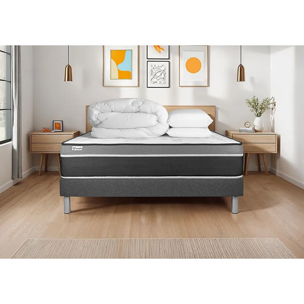 Faites le plein d’énergie positive grâce aux solutions de literie énergisantes Vitalit qui allient confort, maintien et souplesse et permettre à votre corps de prendre le temps de se revitaliser. Les matelas et sommiers Vitalit sont pensés pour s’adapter aux spécificités corporelles et au sommeil de chacun. De fabrication portugaise, les produits Vitalit sont rigoureusement élaborés selon des cahiers des charges précis. Jusqu’à la livraison, notre objectif : votre satisfaction.Découvrez notre matelas hybride haut de gamme VITAL CARE. D’une épaisseur de 26 cm, il allie les meilleures technologies à savoir mousse à mémoire de forme, ressorts ensachés et mousse Hypersoft lui conférant un confort équilibré, un accueil moelleux et un soutien ferme. Ses 7 zones de confort vous permettent une excellente indépendance de couchage et un sommeil réparateur. Optez pour le meilleur du confort et du bien-être.Type de matelas : Mousse polyuréthane à mémoire de forme + ressorts ensachésEpaisseur : 26 cmÂme ressorts ensachés 17 cmCarénage mousse polyuréthane 30kgConfort : EquilibréAccueil : moelleuxSoutien : fermeMousse polyuréthane à mémoire de forme D 55 kg + Mousse polyuréthane Soft HDNombre de ressorts ensachés : 806 pour le 180x200cmIndépendance de couchage : ExcellenteCoutil : Coutil 100% polyester micro perforé ultra-respirablePlate-Bande 3D micro-aérée 100% Polyester pour optimiser l’aération du matelasFibres 100% Polyester 350G/M2Face de couchage : Réversible7 zones de confortCertification : Label Oeko-Tex Standard 100SommierSommier Tapissier à lattes en kit à assembler soi mêmeNombre de lattes : 2 x 16 lattes multiplisStructure et traverses de renfort en pin massifTissu Maille 100% polyester 345G/M2 respirable et résistant certifié OEKO-TEX Standard 100Hauteur 14cm + <