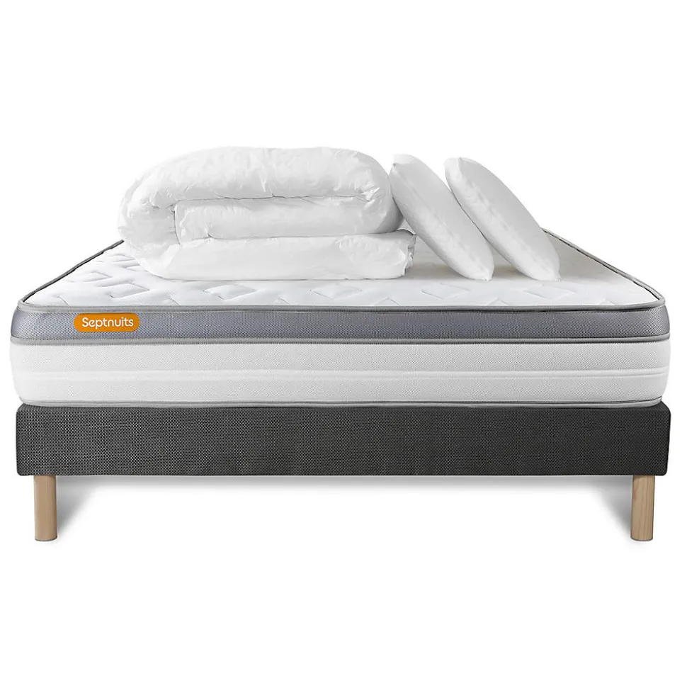 Le matelas Memo Zen de la marque Septnuits bénéficie des dernières innovations en matière de mousse à mémoire de forme pour vous offrir le confort et le soutien unique pour un sommeil récupérateur. Avec un soutien ferme, son accueil à mémoire de forme s’adapte parfaitement à votre morphologie et allège les points de pression en épousant parfaitement votre corps. Ses matériaux de haute qualité : Plate-bande 3D micro aérée, son coutil ultra respirable et sa fibre polyester vous garantissent une aération totale du matelas pour une hygiène optimale.- Type de matelas : Mémoire de forme- Epaisseur : 26 cm- Confort : ferme- Accueil : Ferme avec 2,5 cm de mousse polyuréthane à mémoire de forme D55kg + 2 cm mousse polyuréthane Hypersoft + Fibres 100% Polyester 350G/M2- Soutien : Ferme composé de mousse polyuréthane Haute Densité 21 cm- Indépendance de couchage : Très bonne- Coutil : Tissu 100% polyester Micro perforé ultra-respirable- Bande latérale : Tissu 100% polyester Micro perforé ultra-respirable- Face de couchage : Réversible- Densité : 55 kg/m3- Certification : Label Oeko-Tex Standard 100- Nos matières premières sont certifiées par le label textile OEKO-TEX- Sommier tapissier Monobloc- Nombre de lattes : Multi 12 lattes en peuplier massif- Structures et traverses de renfort en peuplier massif- Garnissage fibres 100% Polyester 120G/M2- Tissu Maille 100% polyester 260 G/M2- Toile de fond anti-poussières 100% polyester- Hauteur 14cm + Pieds bois en pin naturel 15cm- Oreiller mémoire de forme 60 x 40 cm- Mousse polyuréthane à mémoire de forme D50kg- Housse intérieure en vlieseline (100% Polyester)- Housse extérieure déhoussable par fermeture zip et lavable (50% coton – 50% polyester)- Couette 350g Percale- Tissu 100% Coton 80 fils- Garnissage Fibres creuses 100% polyester 350gr/m2 – Type de matelas : Mémoire de forme- Epaisseur :