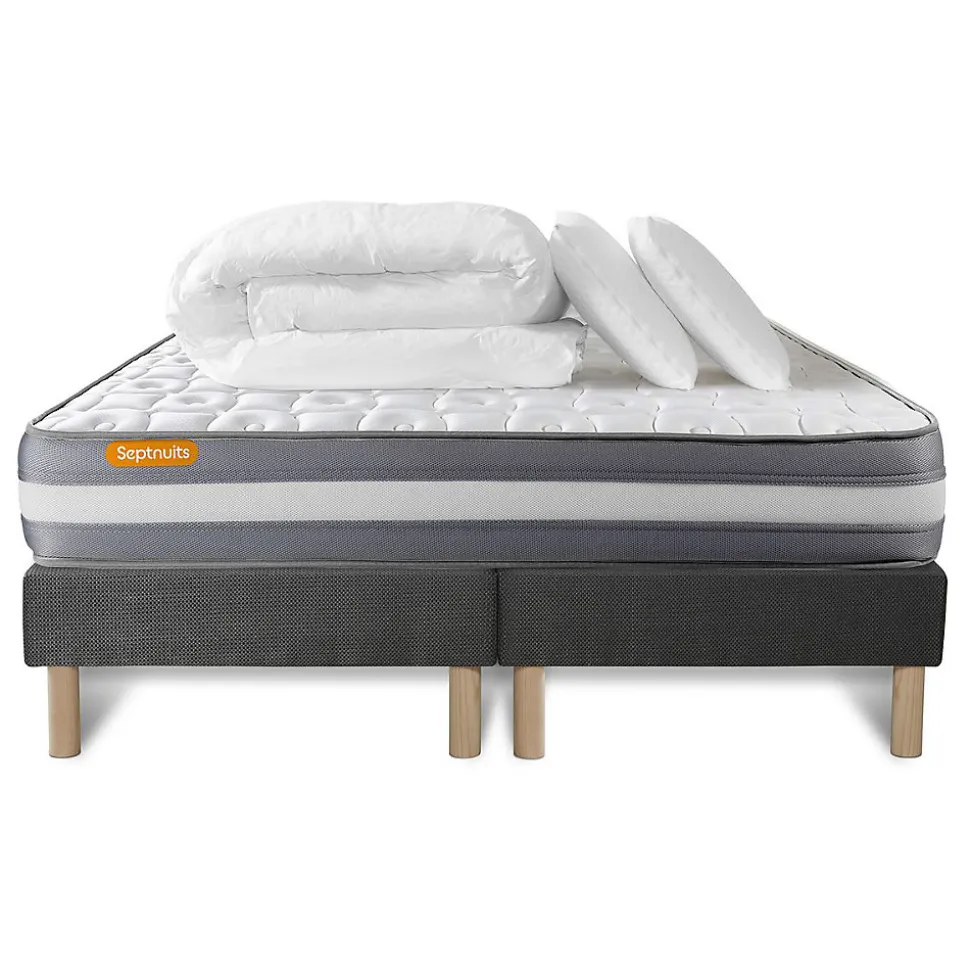 Le matelas Memo Plus de la marque Septnuits bénéficie des dernières innovations en matière de mousse à mémoire de forme pour vous offrir le confort et le soutien unique pour un sommeil récupérateur. Avec un soutien ferme, son accueil enveloppant s’adapte parfaitement à votre morphologie et allège les points de pression en épousant parfaitement votre corps. Ses matériaux de haute qualité : Plate-bande 3D micro aérée, son coutil ultra respirable et sa fibre polyester vous garantissent une aération totale du matelas pour une hygiène optimale.- Type de matelas : Mémoire de forme- Epaisseur : 24 cm- Confort : ferme- Accueil : Ferme avec 1cm de mousse polyuréthane à mémoire de forme D55kg + 4 cm mousse polyuréthane Hypersoft + Fibres 100% Polyester 350G/M2- Soutien : Ferme composé de mousse polyuréthane Haute Densité 16 cm- Indépendance de couchage : Très bonne- Coutil : Tissu 100% polyester Micro perforé ultra-respirable- Bande latérale : Tissu 100% polyester Micro perforé ultra-respirable- Face de couchage : Réversible- Densité : 55 kg/m3- Certification : Label Oeko-Tex Standard 100- Nos matières premières sont certifiées par le label textile OEKO-TEX- Sommier tapissier Monobloc- Nombre de lattes : Multi 2×12 lattes en peuplier massif- Structures et traverses de renfort en peuplier massif- Garnissage fibres 100% Polyester 120G/M2- Tissu Maille 100% polyester 260 G/M2- Toile de fond anti-poussières 100% polyester- Hauteur 14cm + Pieds bois en pin naturel 15cm- Oreiller mémoire de forme 60 x 40 cm- Mousse polyuréthane à mémoire de forme D50kg- Housse intérieure en vlieseline (100% Polyester)- Housse extérieure déhoussable par fermeture zip et lavable (50% coton – 50% polyester)- Couette 350g Percale- Tissu 100% Coton 80 fils- Garnissage Fibres creuses 100% polyester 350gr/m2 – Type de matelas : Mémoire de forme- Epaisseur : 24 cm<