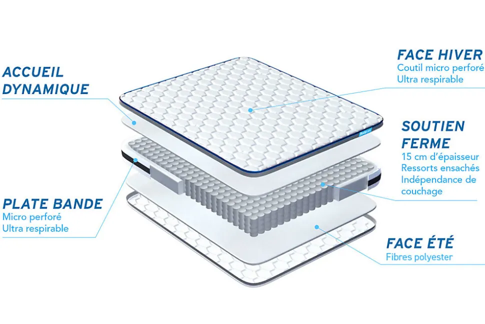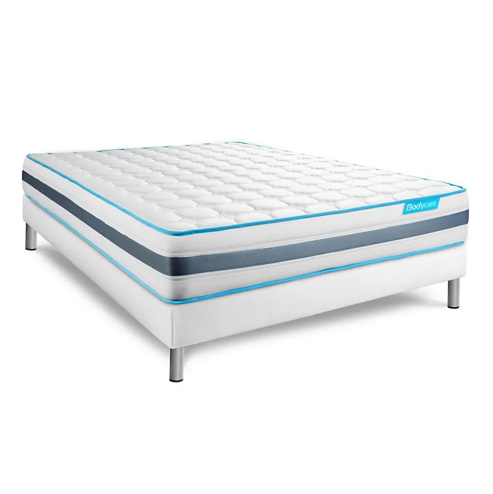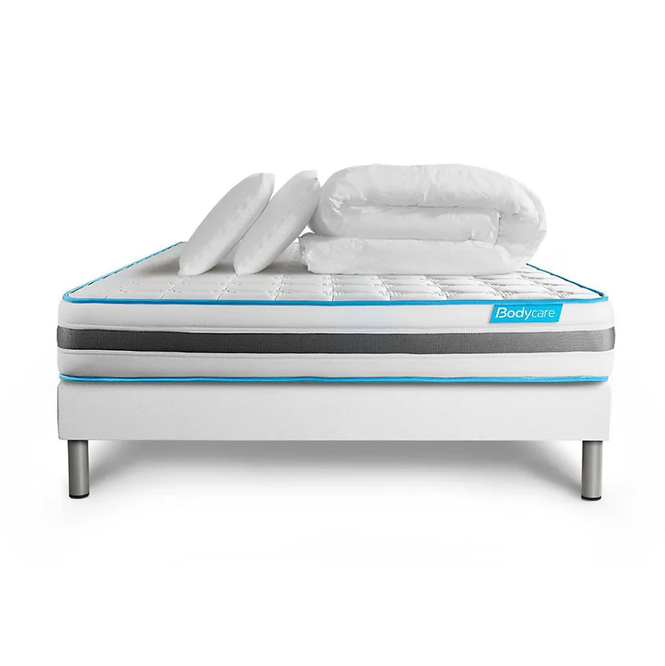 BODYCARE est née de la conviction qu’il n’existe pas de différence entre le corps d’un sportif de haut niveau et celui d’un sportif du quotidien. Pour ces sportifs de haut niveau, comme pour vous, le sommeil est une phase prépondérante dans le processus de récupération physique, nerveuse et psychologique. Nos produits sont conçus en collaboration étroite avec des sportifs. Les matelas BODYCARE allient confort, maintien et souplesse afin de permettre à votre corps de se revitaliser pour récupérer du stress de la journée.Le Pack BODYZONE de BODYCARE est constitué de 580 ressorts ensachés procurant un soutien ferme et progressif. Sa conception unique offre un accueil dynamique et accompagne chaque mouvement de votre corps pour s’ajuster à chaque morphologie. Sa maxi épaisseur vous apporte douceur de contact et maintien enveloppant. Sa plate‐Bande 3D micro aérée, associée à son coutil micro perforé ultra respirable vous garantissent une aération optimisée du matelas. Il vous est livré avec 1 couette de qualité et de 2 oreillers mémoire de forme.- Épaisseur : 24 cm- Âme ressorts ensachés 15 cm- Carénage mousse polyuréthane- Garnissage fibres polyester 350G/M2- Plate-Bande 100% polyester micro-aérée pour optimiser l’aération du matelas- Coutil 100% polyester micro perforé ultra respirable – Confort : Accueil Dynamique – Soutien ferme- 3 zones de confort- Sommier tapissier- Multi 12 lattes en peuplier massif- Structure et traverses de renfort en peuplier massif- Garnissage fibres 100% polyester 120G/M2- Tissu Maille 100% polyester 260G/M2- Toile de fond anti-poussières 100% polyester- Hauteur 14cm + Pieds acier 15cm (fournis)- 2 oreillers à mémoire de forme- Mousse polyuréthane à mémoire de forme D50kg- Housse intérieur en vieseline (100% polyester)- Housse extérieur déhoussable par fermeture zip et lavable (50% coton – 50% polyester)- Âme ressorts
