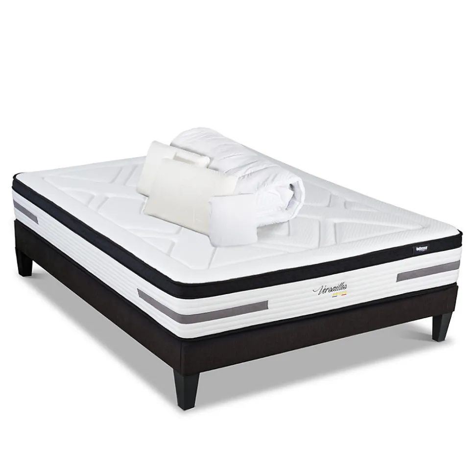 MatelasCARACTERISTIQUES :Dimensions disponibles (cm) : 140×190 – 140×200 – 160×200 – 180x200Epaisseur : 24 cmTechnologie : Ressorts ensachésAccueil : ProgressifSoutien : FermeIndépendance de couchage : 5/5Aération : 5/5Non déhoussableGaranti 10 ansLivré rouléCOMPOSITION :Âme intérieure (CertiPUR) : 713 ressorts ensachés de 18 cm + 2 cm de mousse polyuréthane de 28 kg/m³ sur la face couchageCoutil (Oeko-Tex) :- Face couchage : Tissu stretch de 275 gr/m² – Garnissage 0,5 cm de mousse viscoélastique à mémoire de forme + 100 gr/m² de fibres + 1,5 cm de mousse polyuréthane supersoft- Face sommier : Tissu 3D Basique – Garnissage 100 gr/m² de fibres + 1 cm de mousse polyuréthanePOINTS FORTS :Soutien adapté (ressorts ensachés)Confort ergonomique (mousse à mémoire de forme)Accueil enveloppant (mousse supersoft)SommierCARACTERISTIQUES :Dimensions disponibles (cm) : 140×190 – 140×200 – 160×200 – 180x200Suspension : Tri-lattesHauteur (avec pieds) : 30 cmNombre de pieds : 4Nombre de lattes : 2x24Matière : BoisGaranti 5 ansLivré en kitPOINTS FORTS :ConfortRobustesseTransport et montage facilesIntégrable dans cadre de litAccessoires inclus2 Oreillers mémoire de forme 40×60 cm1 Couette thermo-isolante 200×200 cm1 Alèse absorbante 140×190/200 cm