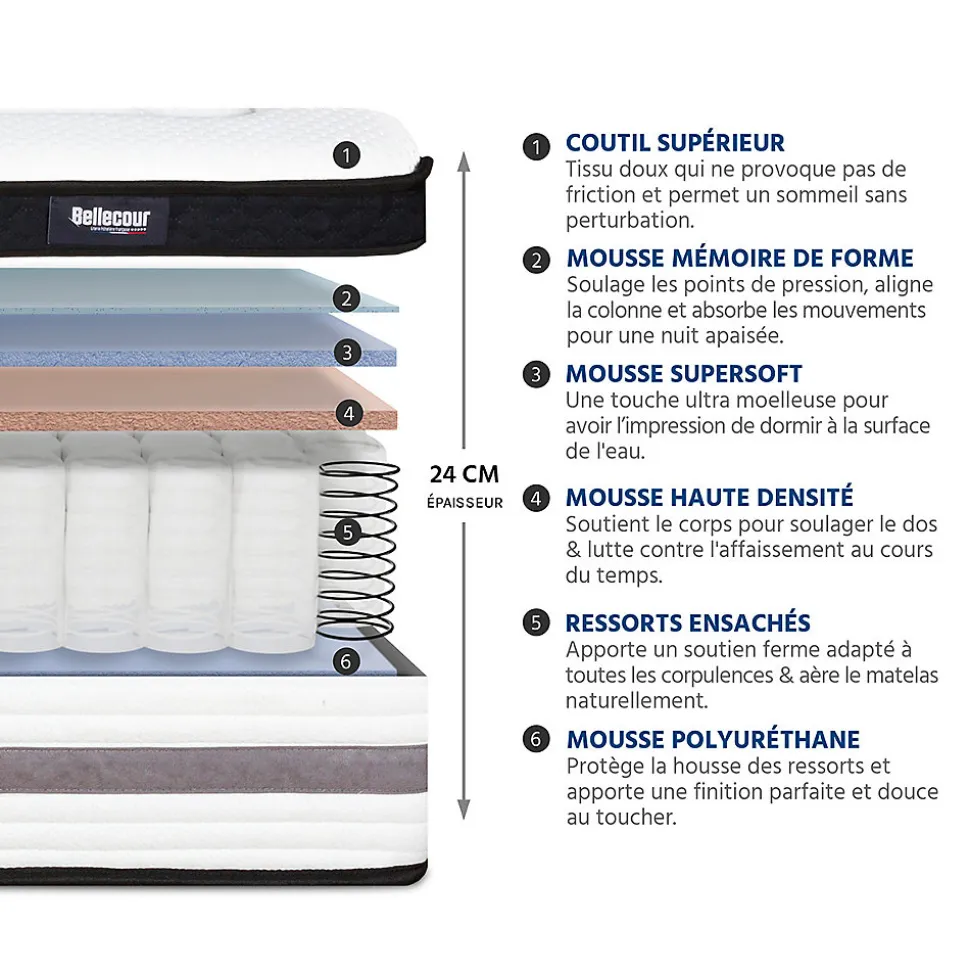 - POINTS FORTS MATELAS : Soutien précis de chaque partie du corps (ressorts ensachés) – Ergonomie et indépendance de couchage (mousse à mémoire de forme) – Accueil doux et moelleux (mousse supersoft)
