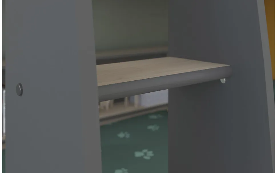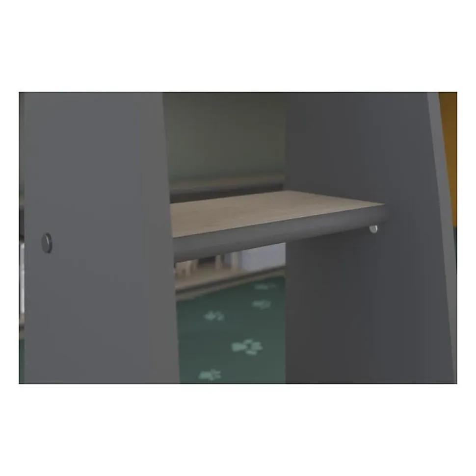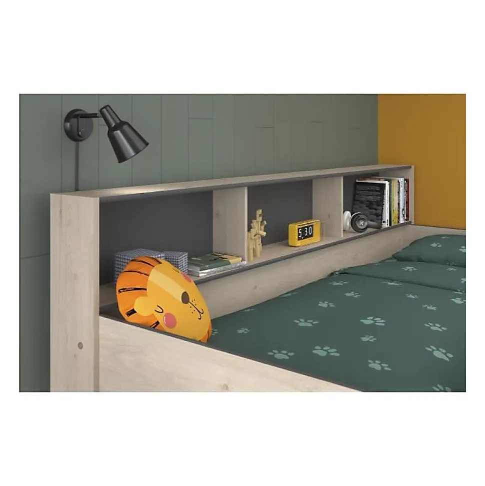 Un lit superposé joli et jeune en aggloméré de haute qualité avec un décor en chene et une finition grise. Chaque lit a une bibliotheque horizontale.Le lit superposé a une échelle large et des bords élevés pour éviter que votre enfant tombe de son lit quand il dort. Veuillez noter que le lit peut se monter uniquement comme sur les photos. Chaque bibliotheque a trois niches.Ce lit est livré avec … Voir la présentat…