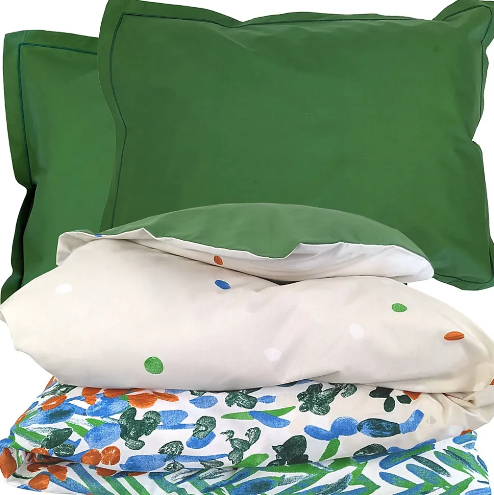 Parure de lit composée d’une housse de couette 280×240 cm et 2 taies 50×70 cm unies EVASION Vert fougère 100% coton avec des motifs de végétation vert, bleu et corail.