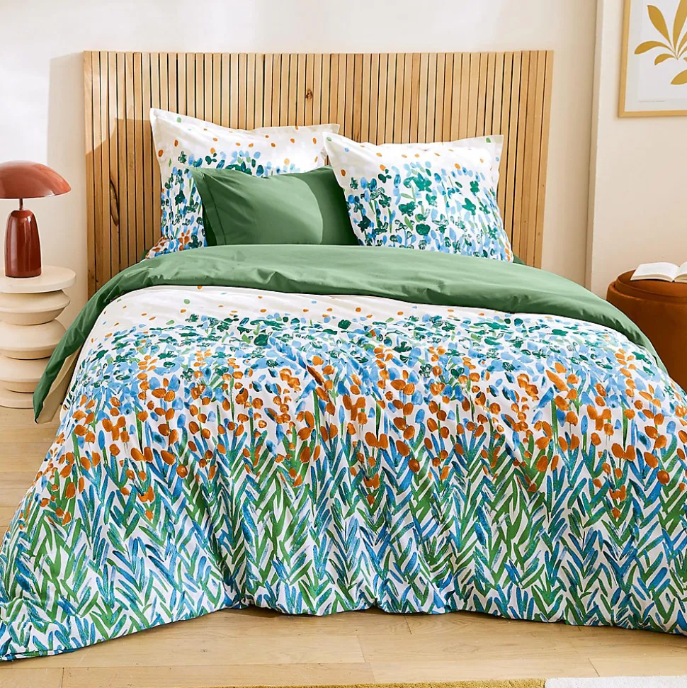 Parure de lit composée d’une housse de couette 300×240 cm et 2 taies 65×65 cm EVASION Vert fougère 100% coton avec des motifs de végétation vert, bleu et corail.