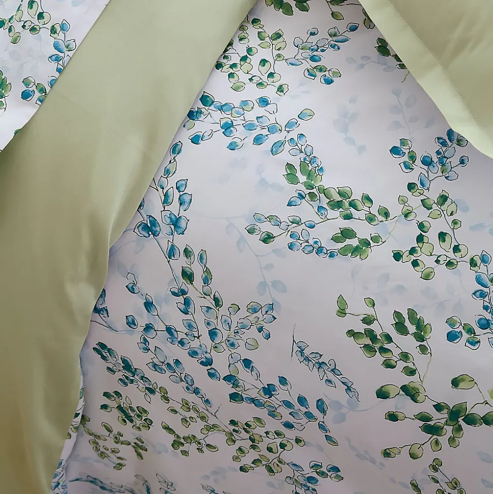 Cette parure de couette évoque la fraîcheur et la tranquillité d’une balade sous les tilleuls en fleur.. Le recto de la housse de couette est orné d’un délicat imprimé de petites feuilles de tilleul en vert et bleu sur un fond blanc, évoquant la quiétude de la nature printanière.. En revanche, le verso présente une teinte unie vert amande, apportant une note de douceur et d’harmonie à l’ensemble.. Les taies d’oreiller assorties reprennent le même motif végétal que la housse de couette, offrant ainsi une continuité visuelle parfaite dans votre ensemble de literie.. Fabriquée en satin de coton de haute qualité avec un tissage de 110 fils/cm², elle offre une sensation de douceur et de confort exceptionnelle.. De plus, le traitement honey touch confère à la matière une texture soyeuse, garantissant des nuits de sommeil paisibles et réparatrices.. Offrez-vous une oasis de sérénité avec cette parure de couette, qui transformera votre chambre en un véritable havre de paix naturel.. . Tailles disponibles : 140 x 200 cm, 200 x 200 cm, 240 x 220 cm, et 260 x 240 cm.. Taies d’oreiller : 65 x 65 cm. Composition : Satin de coton, 110 fils/cm².. Traitement honey touch.. Lavable en machine à 40°C.. . Vendue à l’unité, avec une ou deux taies d’oreiller assorties, selon le modèle