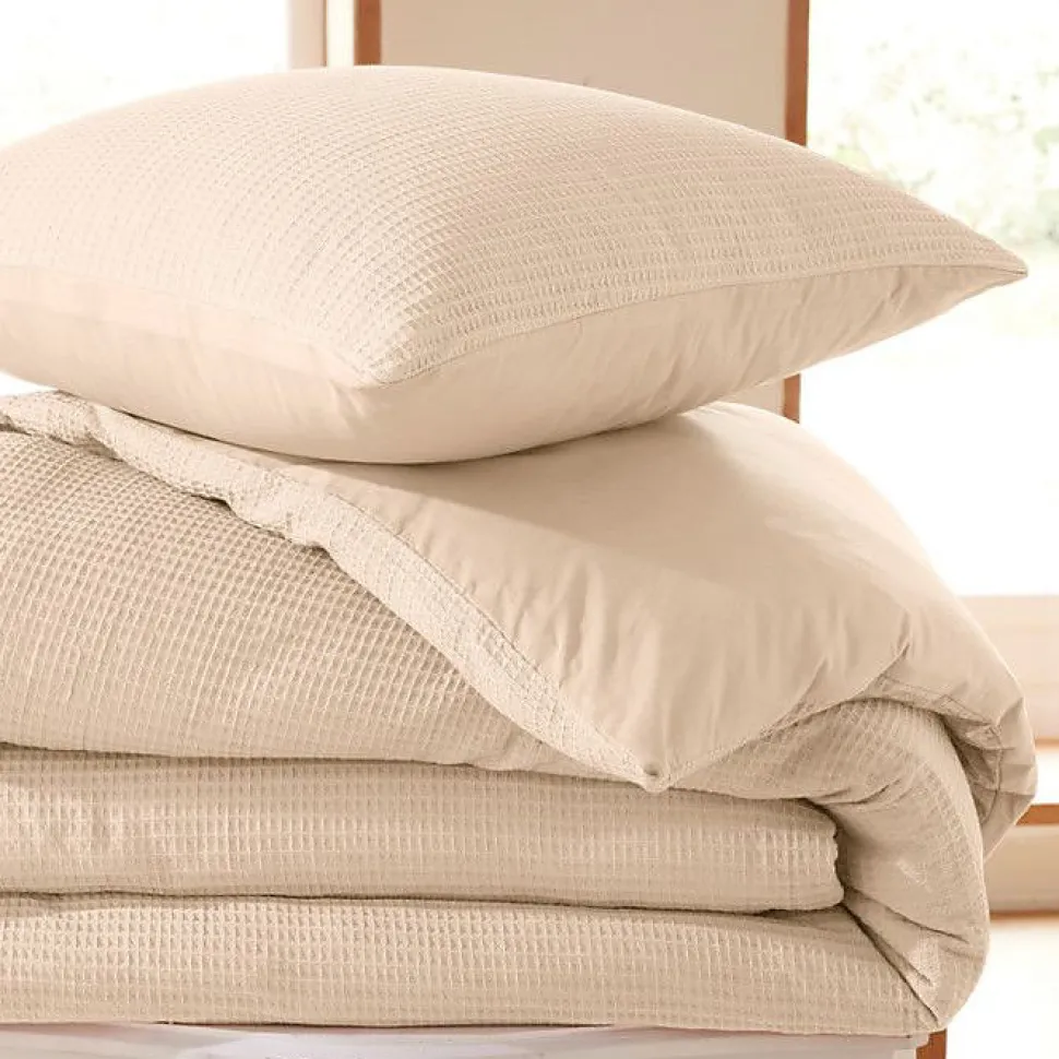 Parure 140 x 200 en coton nid d’abeille, légère et respirante, comprenant 1 housse de couette et 1 taie 65 x 65 cm. Motif nid d’abeille uni, finition boutonnée, lavable à 40° et repassable à basse température. Certifiée Oeko-Tex.