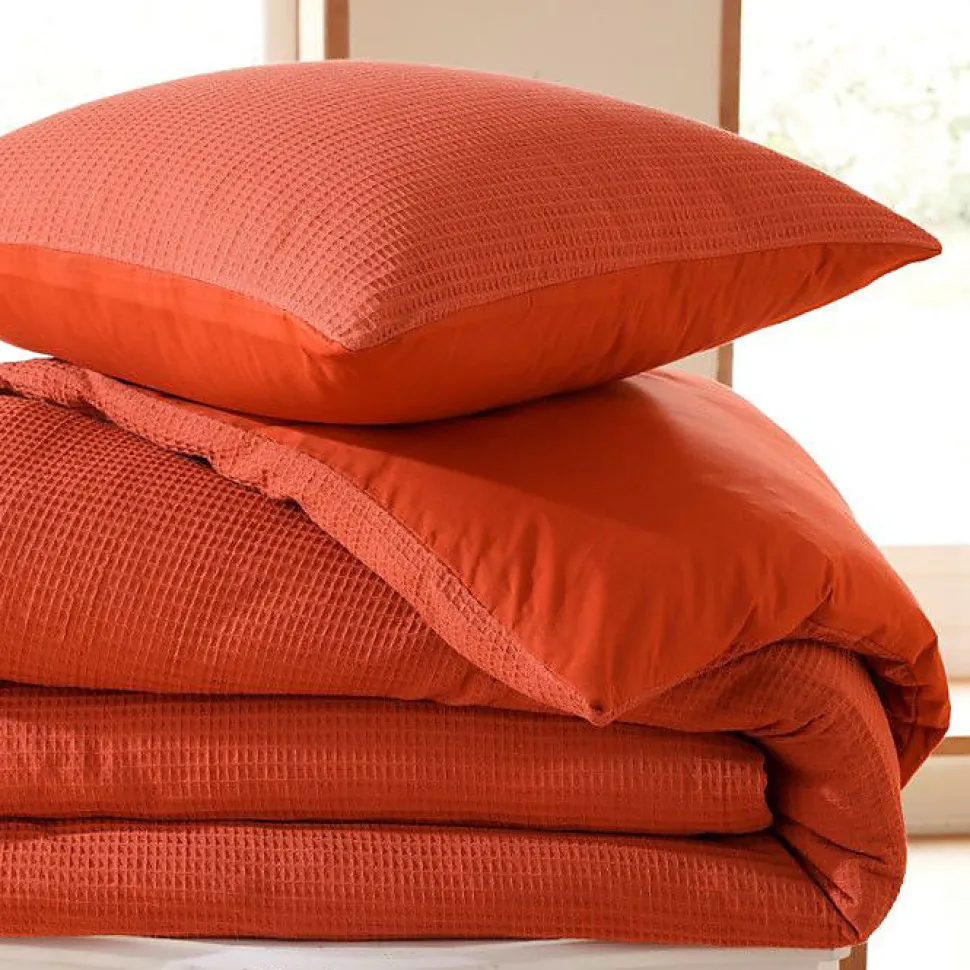 Parure en coton nid d’abeille 240 x 220 cm (pour lit 2 places), texture cocooning, pack 1 housse + 2 taies 65 x 65 cm, fermeture par boutons, lavable à 40°, certifiée Oeko-Tex.