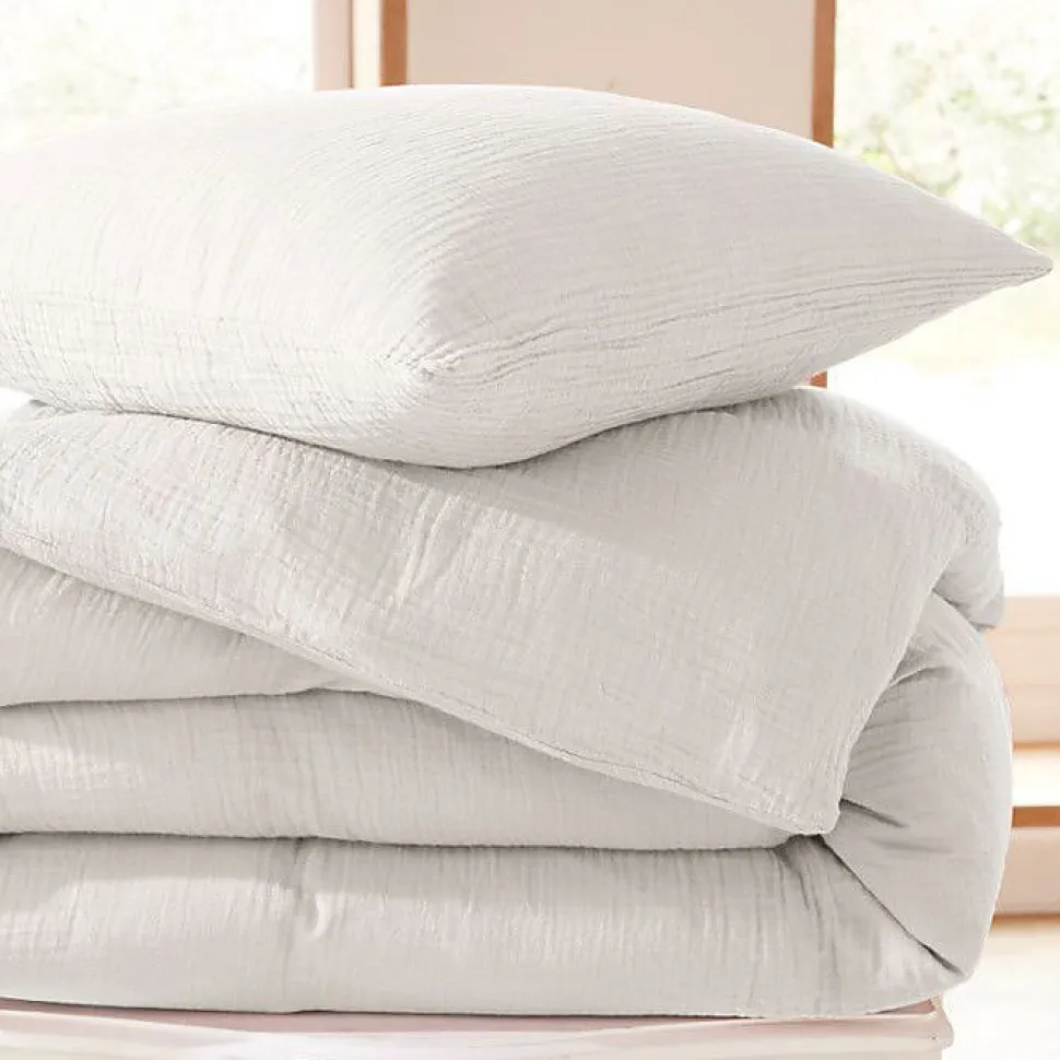 Parure complète : 1 housse de couette 260 x 240 cm + 2 taies 65 x 65 cm. 100% double gaze de coton 125 g/m², légère, fluide et très douce. Fermeture par boutons, bonnet adapté. Lavage machine 40°C, sèche-linge autorisé, pas de repassage nécessaire. Label DETOX TO ZERO by OEKO-TEX.