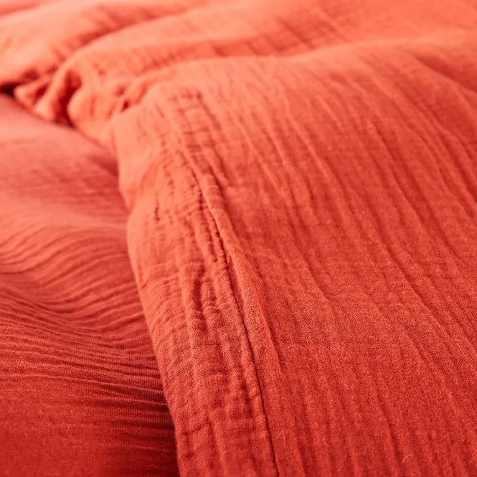Parure complète 1 housse de couette 260 x 240 cm + 2 taies 65 x 65 cm en double gaze de coton 125 g/m² : très douce, légère et respirante. Bonnet 30 cm, entretien facile (machine 40°, sèche-linge autorisé), label DETOX TO ZERO by OEKO-TEX. Couleur Terracotta, aspect délicatement froissé qui s’embellit au fil du temps.