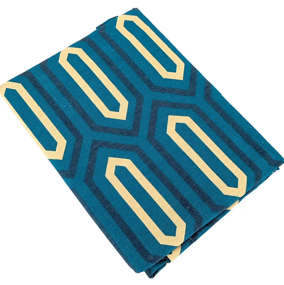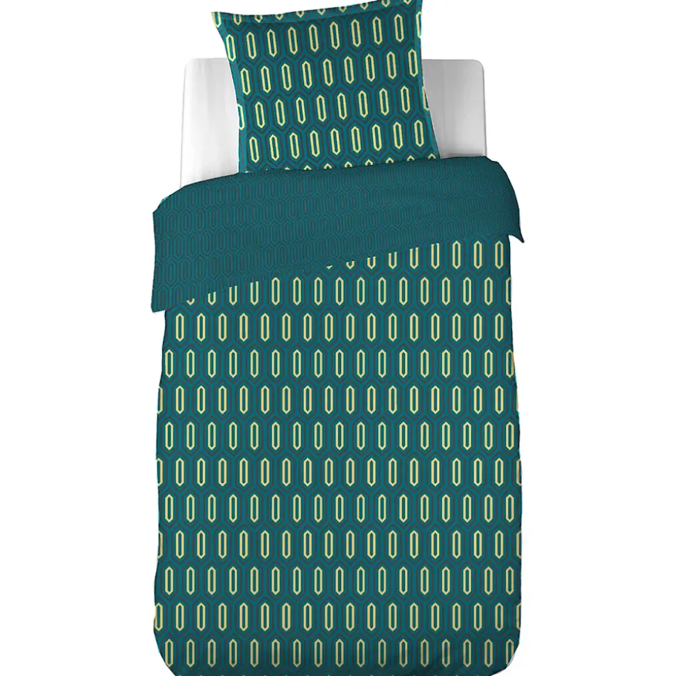 - Parure de lit en percale de coton avec un motif de losanges imbriqués formant un effet géométrique moderne dans des tons de jaune et bleu sur fond bleu canard.