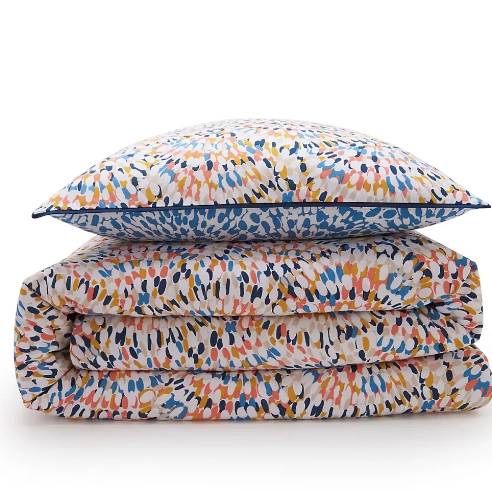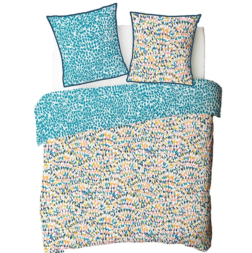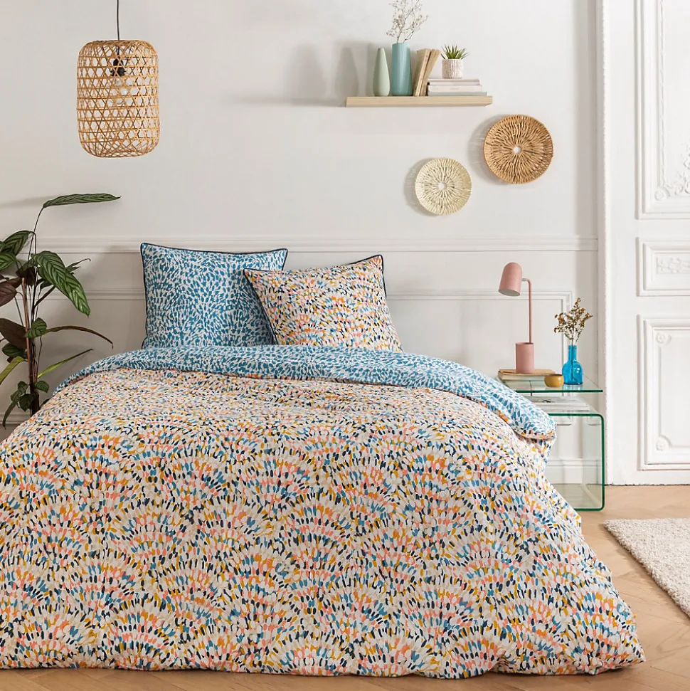 Parure de lit en coton réversible imprimé 57 fils multicolore comprenant 1 housse de couette + 2 taies d’oreiller 63x63cm.Avec notre parure de lit ORIANE en 100% coton, nous avons opté pour un motif floral abstrait.Ces motifs d’inspiration traditionnels, déclinés dans une gamme de tons neutres rose et vert, revisitent avec succès le style floral qu’on aime tant. N’attendez plus, et craquez vous aussi pour notre parure de lit ORIANE.Ce linge de lit imaginé par nos stylistes, conçu dans un tissage 57 fils/cm² est composé d’une housse de couette réversible finition boutons qui sauvera votre couette d’une évasion certaine.COMPOSITIONS PRODUIT :Matière : 100% cotonCouleur : Multicolore, rose, vert, bleuCertification : OEKO-TEXLavage : à 60° en machine2 taies d’oreiller 63x63cm finition biais plat 5mmLa parure de lit ORIANE vous est envoyée dans un pochon en tissu réutilisable, aux motifs de la housse de couette, et transformable en tote-bag une fois que vos draps trôneront fièrement sur votre lit. En savoir plus :Ce produit labélisé STANDARD 100 by OEKO-TEX – certificat n° 18.HPK48415 HOHENSTEIN HTTI suit un processus de fabrication certifié et contrôlé, respectueux de votre peau.Le STANDARD 100 by OEKO-TEX EST un label qui vous garantit que vos draps ne contiennent aucuns produits toxiques ni pour votre santé, ni pour l’environnement.