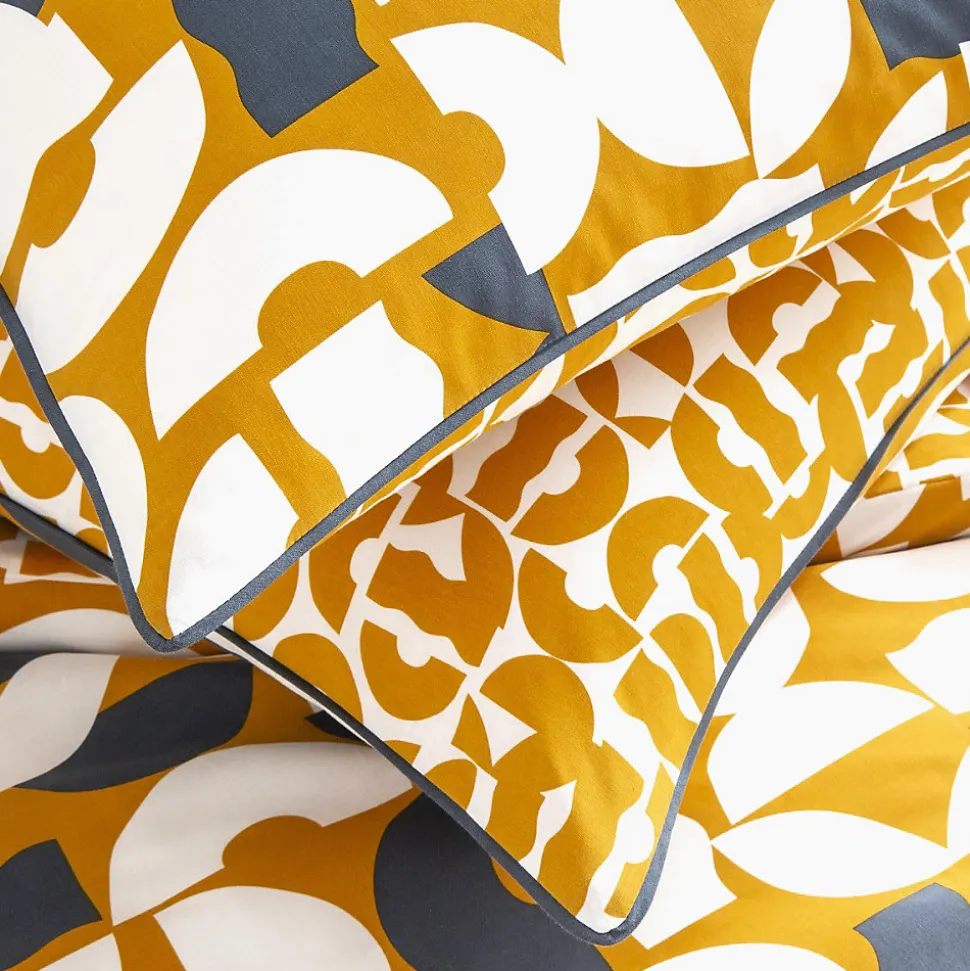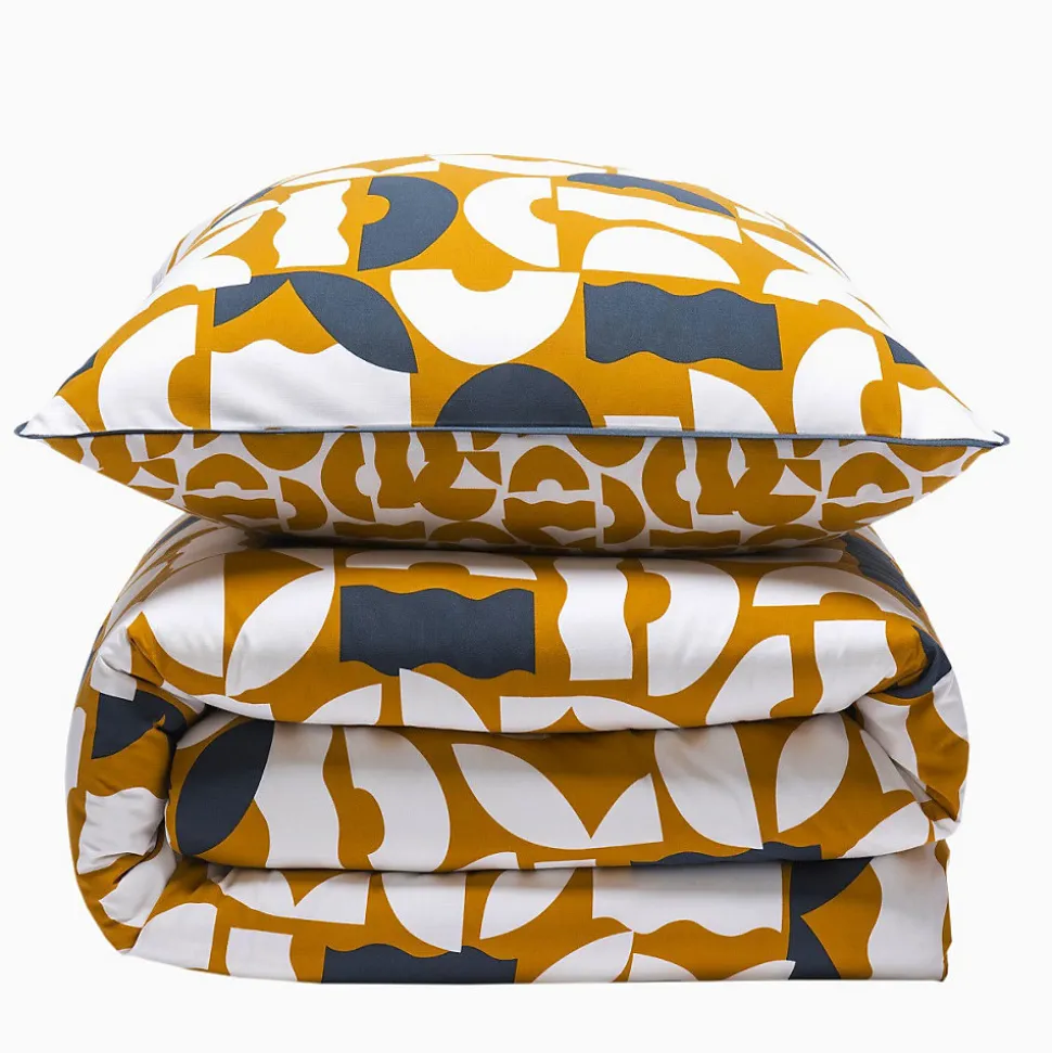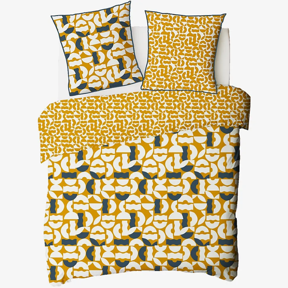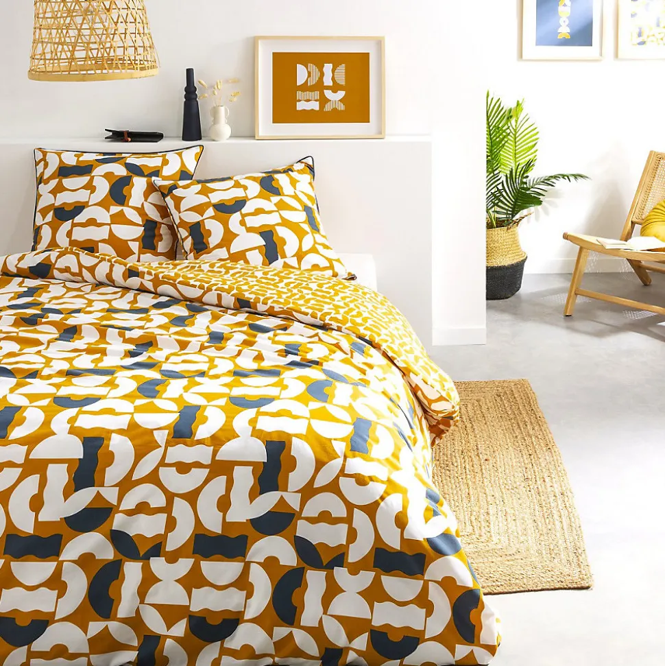 Parure de lit en coton réversible imprimé géométrique 57 fils curry comprenant 1 housse de couette + 2 taies d’oreiller 63x63cm.Avec notre parure de lit FIDJI en 100% coton, nous avons opté pour le come-back des imprimés géométriques et affirmés. L’association de notre coloris curry avec un motif géométrique inattendue, apporte un cocktail qui fonctionne à la perfection ! Ces motifs audacieux et colorés réchaufferont l’atmosphère de votre maison en un clin d’œil. N’attendez plus, et craquez vous aussi pour notre parure de lit FIDJI.Ce linge de lit imaginé par nos stylistes, conçu dans un tissage 57 fils/cm² est composé d’une housse de couette réversible finition boutons qui sauvera votre couette d’une évasion certaine.COMPOSITIONS PRODUIT :Matière : 100% cotonCertification : OEKO-TEXLavage : à 60° en machine2 taies d’oreiller 63x63cm finition biais platLa parure de lit FIDJI vous est envoyée dans un pochon en tissu réutilisable, aux motifs de la housse de couette, et transformable en tote-bag une fois que vos draps trôneront fièrement sur votre lit. En savoir plus :Ce produit labélisé STANDARD 100 by OEKO-TEX – certificat n° 18.HPK48415 HOHENSTEIN HTTI suit un processus de fabrication certifié et contrôlé, respectueux de votre peau.Le STANDARD 100 by OEKO-TEX EST un label qui vous garantit que vos draps ne contiennent aucun produits toxiques ni pour votre santé, ni pour l’environnement.
