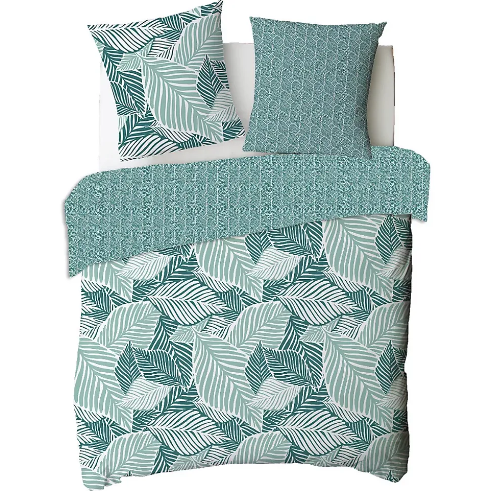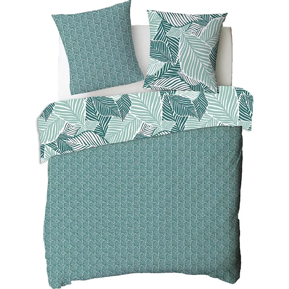 Parure de lit Réversible en Coton Imprimé – pour 2 PersonnesAjoutez une touche d’élégance et de confort à votre chambre avec cet ensemble de literie réversible, spécialement conçu pour un lit double. Il inclut une housse de couette et deux taies d’oreiller (63×63 cm), idéal pour deux personnes.Orné d’un imprimé abstrait vert et offrant un design réversible, cet ensemble vous permet de renouveler facilement le style de votre chambre. Fabriqué en 100% coton de haute qualité, il assure une douceur agréable pour des nuits paisibles. Le tissage de 57 fils garantit une durabilité et un confort exceptionnel.Conçu dans le respect de votre santé, cet ensemble est certifié Oeko-Tex, garantissant l’absence de produits chimiques nocifs. Il est lavable en machine à 60°, facile à entretenir et conserve ses couleurs de manière optimale.Les finitions boutons assurent un maintien sécurisé de la couette, tandis que l’ensemble est présenté dans un pochon en coton réutilisable.Caractéristiques :Ensemble pour 2 personnes : 1 housse de couette + 2 taies d’oreiller (63×63 cm)Réversible avec un imprimé abstrait vert100% coton, 57 filsLavable en machine à 60°Certifié Oeko-TexFinitions boutonsPrésenté dans un pochon en coton réutilisablePourquoi opter pour cet ensemble ? Son design moderne, la douceur de son coton et son engagement la planète en font un choix idéal pour allier style et confort.