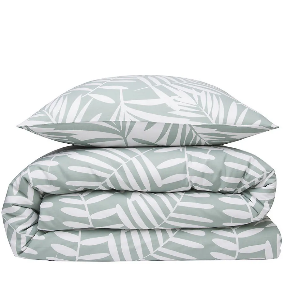 Parure de lit en polycoton réversible imprimé feuillage 57 fils verte RIGA comprenant 1 housse de couette + 2 taies d’oreiller 63x63cm.Avec notre parure de lit RIGA en polycoton, nous avons opté pour un motif feuillage.Ces motifs déclinés dans une gamme de tons colorés, revisitent avec succès le style floral qu’on aime tant. Notre parure apporte un style sophistiqué et original à votre intérieur. N’attendez plus, et craquez vous aussi pour notre parure de lit RIGA.Ce linge de lit imaginé par nos stylistes, conçu dans un tissage 57 fils/cm² est composé d’une housse de couette réversible finition boutons qui sauvera votre couette d’une évasion certaine.A compléter avec nos draps-housses de la collection ESSENTIEL – FUTURE HOME.COMPOSITION PRODUIT :Matière : polycotonCouleurs : vert, blancCertification : OEKO-TEXLavage : à 60°C en machine2 taies d’oreiller 63x63cmLa parure de lit RACHEL vous est envoyée dans un pochon en tissu réutilisable, aux motifs de la housse de couette, et transformable en tote-bag une fois que vos draps trôneront fièrement sur votre lit. En savoir plus :Ce produit labélisé STANDARD 100 by OEKO-TEX – certificat n° 18.HPK48415 HOHENSTEIN HTTI suit un processus de fabrication certifié et contrôlé, respectueux de votre peau.Le STANDARD 100 by OEKO-TEX EST un label qui vous garantit que vos draps ne contiennent aucuns produits toxiques ni pour votre santé, ni pour l’environnement.