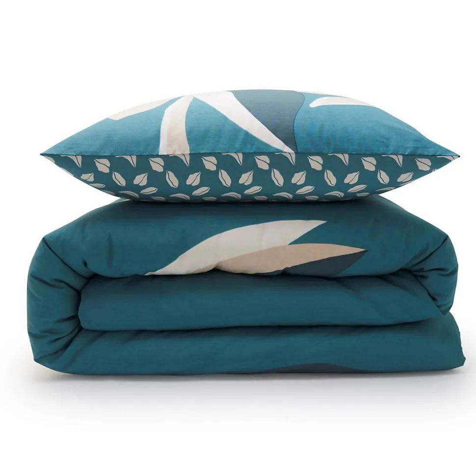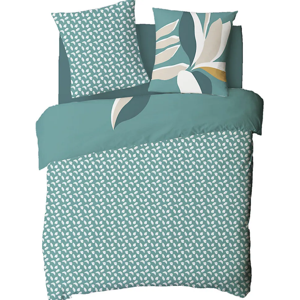 Parure de lit en coton réversible imprimé tropical 57 fils bleu vert comprenant 1 housse de couette + 2 taies d’oreiller 63x63cm.Avec notre parure de lit ODALIE en 100% coton, nous avons opté pour un motif feuillage / tropical.Ces motifs d’inspiration nature, déclinés dans une gamme de tons neutres verts, revisitent avec succès le style jungle qu’on aime tant. Grâce à notre parure, vous aurez la possibilité de faire voyager votre intérieur et de ramener un esprit de nature jusque chez vous. N’attendez plus, et craquez vous aussi pour notre parure de lit ODALIE.Ce linge de lit imaginé par nos stylistes, conçu dans un tissage 57 fils/cm² est composé d’une housse de couette réversible finition boutons qui sauvera votre couette d’une évasion certaine.A compléter avec nos draps-housses de la collection ESSENTIEL – FUTURE HOME.COMPOSITION PRODUIT :Matière : 100% cotonCouleur : Bleu vertLavage : à 60° en machine2 taies d’oreiller 63x63cmLa parure de lit ODALIE vous est envoyée dans un pochon en tissu réutilisable, aux motifs de la housse de couette, et transformable en tote-bag une fois que vos draps trôneront fièrement sur votre lit. En savoir plus :Ce produit labélisé STANDARD 100 by OEKO-TEX – certificat n° 18.HPK48415 HOHENSTEIN HTTI suit un processus de fabrication certifié et contrôlé, respectueux de votre peau.Le STANDARD 100 by OEKO-TEX EST un label qui vous garantit que vos draps ne contiennent aucuns produits toxiques ni pour votre santé, ni pour l’environnement.