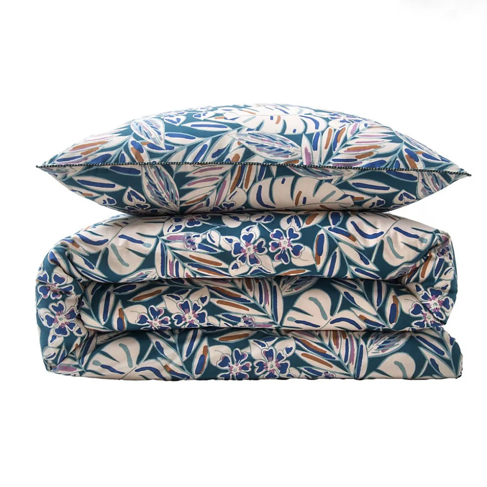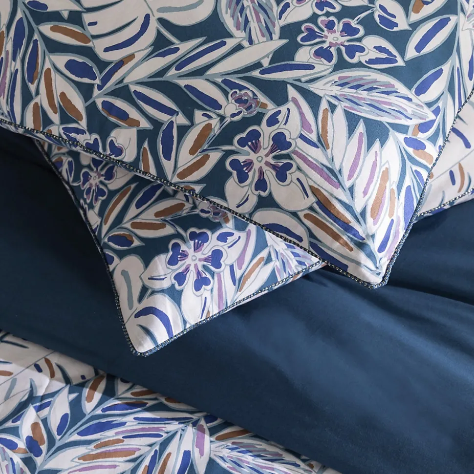 Parure de lit en coton réversible imprimé feuilles graphiques 57 fils bleu comprenant 1 housse de couette + 2 taies d’oreiller 63x63cm.Avec notre parure de lit NOUK en 100% coton, nous avons opté pour un motif de feuillages. Ces motifs d’inspiration naturel, déclinés dans une gamme de tons bleus, revisitent avec succès le style graphique qu’on aime tant. N’attendez plus, et craquez vous aussi pour notre parure de lit NOUK.Ce linge de lit imaginé par nos stylistes, conçu dans un tissage 57 fils/cm² est composé d’une housse de couette réversible finition boutons qui sauvera votre couette d’une évasion certaine.COMPOSITIONS PRODUIT :Matière : 100% cotonCouleur : Bleu, blanc et jauneMotif : VégétalCertification : OEKO-TEXLavage : à 60°C en machine2 taies d’oreiller 63x63cm finition biais lurexLa parure de lit NOUK vous est envoyée dans un pochon en tissu réutilisable, aux motifs de la housse de couette, et transformable en tote-bag une fois que vos draps trôneront fièrement sur votre lit. En savoir plus :Ce produit labélisé STANDARD 100 by OEKO-TEX – certificat n° 18.HPK48415 HOHENSTEIN HTTI suit un processus de fabrication certifié et contrôlé, respectueux de votre peau.Le STANDARD 100 by OEKO-TEX EST un label qui vous garantit que vos draps ne contiennent aucuns produits toxiques ni pour votre santé, ni pour l’environnement.