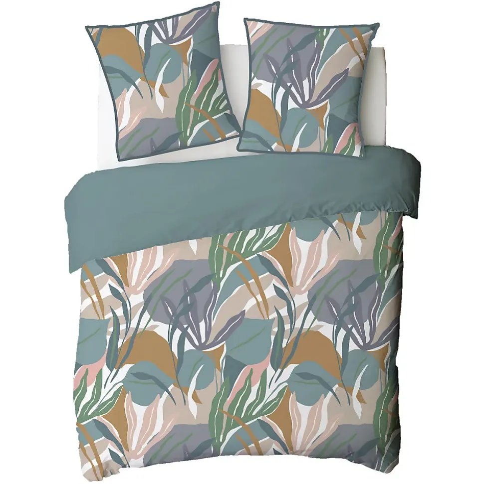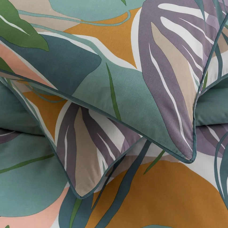 Parure de lit en coton réversible imprimé végétal abstrait 57 fils multicolore comprenant 1 housse de couette + 2 taies d’oreiller 63x63cm.Avec notre parure de lit PALMA en 100% coton, nous avons opté pour un motif végétal / tropical.Ces motifs d’inspiration nature, déclinés dans une gamme de tons neutres et pastels, revisitent avec succès le style jungle qu’on aime tant. Grâce à notre parure, vous aurez la possibilité de faire voyager votre intérieur et de ramener un esprit de nature jusqu’à chez vous. N’attendez plus, et craquez vous aussi pour notre parure de lit PALMA.Ce linge de lit imaginé par nos stylistes, conçu dans un tissage 57 fils/cm² est composé d’une housse de couette réversible finition boutons qui sauvera votre couette d’une évasion certaine.COMPOSITIONS PRODUIT :Matière : 100% cotonCouleur : Multicolore, violet, vert, jauneCertification : OEKO-TEXLavage : à 60° en machine2 taies d’oreiller 63x63cm finition piping 5mmLa parure de lit PALMA vous est envoyée dans un pochon en tissu réutilisable, aux motifs de la housse de couette, et transformable en tote-bag une fois que vos draps trôneront fièrement sur votre lit. En savoir plus :Ce produit labélisé STANDARD 100 by OEKO-TEX – certificat n° 18.HPK48415 HOHENSTEIN HTTI suit un processus de fabrication certifié et contrôlé, respectueux de votre peau.Le STANDARD 100 by OEKO-TEX EST un label qui vous garantit que vos draps ne contiennent aucuns produits toxiques ni pour votre santé, ni pour l’environnement.
