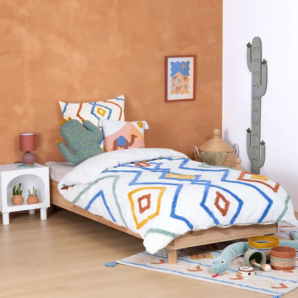 La parure de lit 2 pièces enfant « Adi » Atmosphera for kids est composée d’une housse de couette en coton lavé et d’une taie d’oreiller carrée qui équiperont un lit d’enfant de dimensions standards. Gaie et chaleureuse, cette parure de lit est surpiquée de motifs graphiques et colorés en coton tufté. 100 % coton lavé, 57 fils/cm2Motifs en coton tuftéFermeture de la housse de couette : 4 boutons Déballage et montage Lors de l’ouverture de votre colis, veillez à ne pas enfoncer une lame trop profondément pour éviter d’endommager le produit. Retirez les éléments de protection et d’emballage avec précaution, sans utiliser d’outils tranchants. Conservez l’emballage et la notice quelques jours en cas de retour ou de démontage. Consultez les consignes de tri de votre commune pour recycler correctement votre emballage. Conseils d’entretien La parure de lit 2 pièces enfant « Adi » est lavable en machine à 30°. Ne pas sécher en machine. Repassage à température moyenne (110°C à 150°C). Ne pas utiliser de produits de blanchiment. Ne pas nettoyer à sec.Dimensions produit : L.190 x l.137,7 x H.0,3 cmPoids : 1,4 Kg