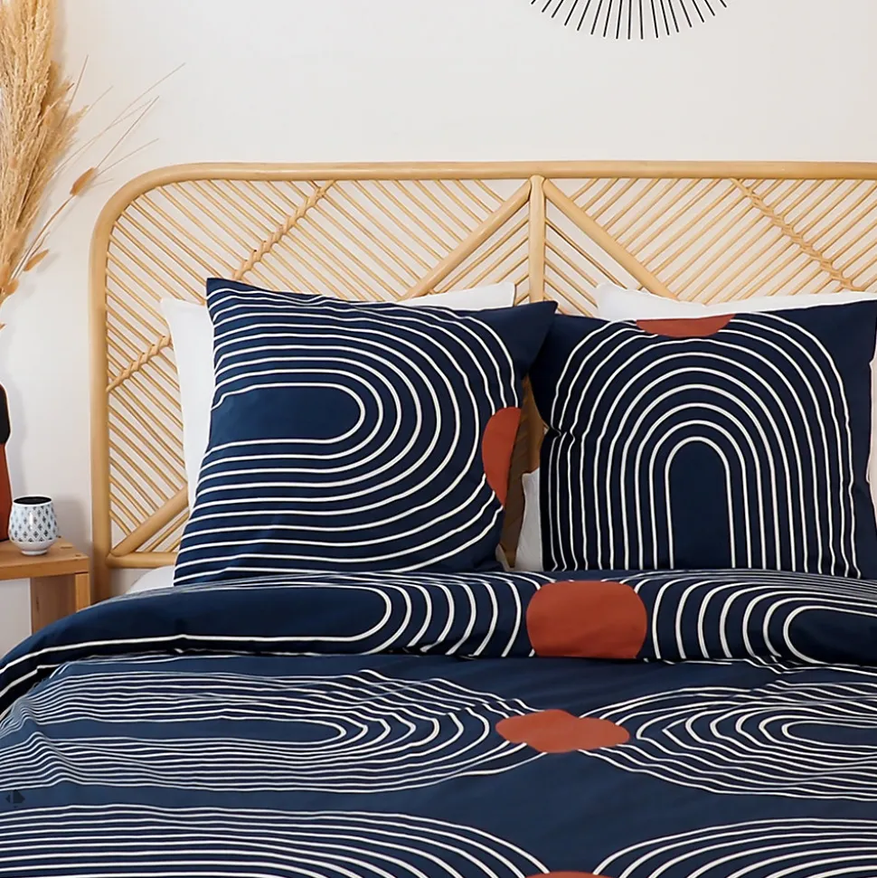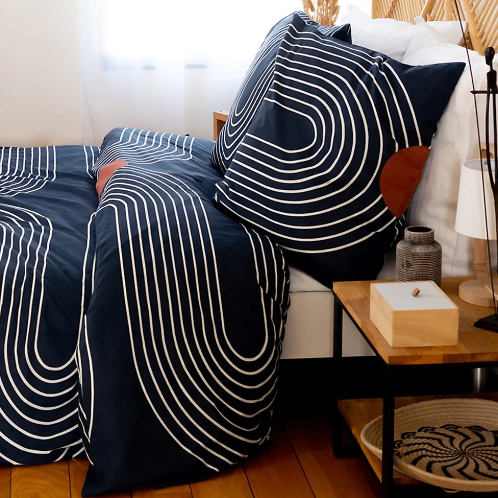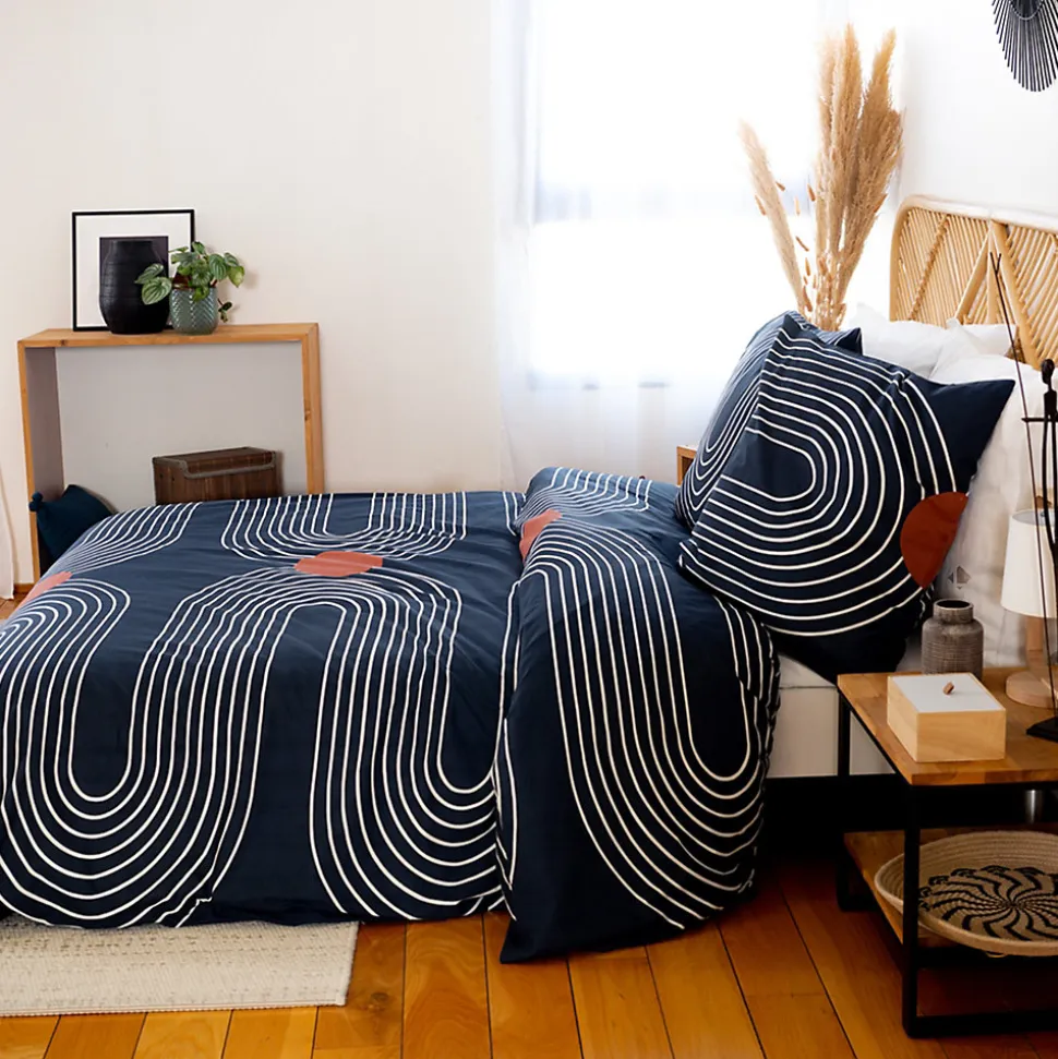 - Parure de lit en coton adouci parfaite pour un look hypnotique dans votre chambre avec un motif de grandes lignes blanches tout en courbe et de grand rond orange terracotta sur fond bleu nuit.