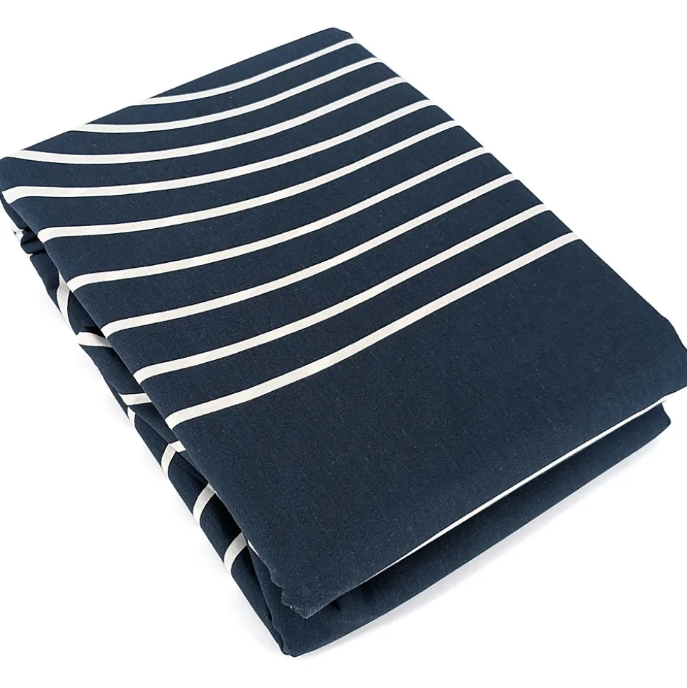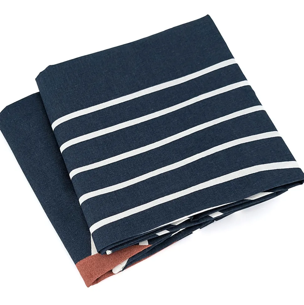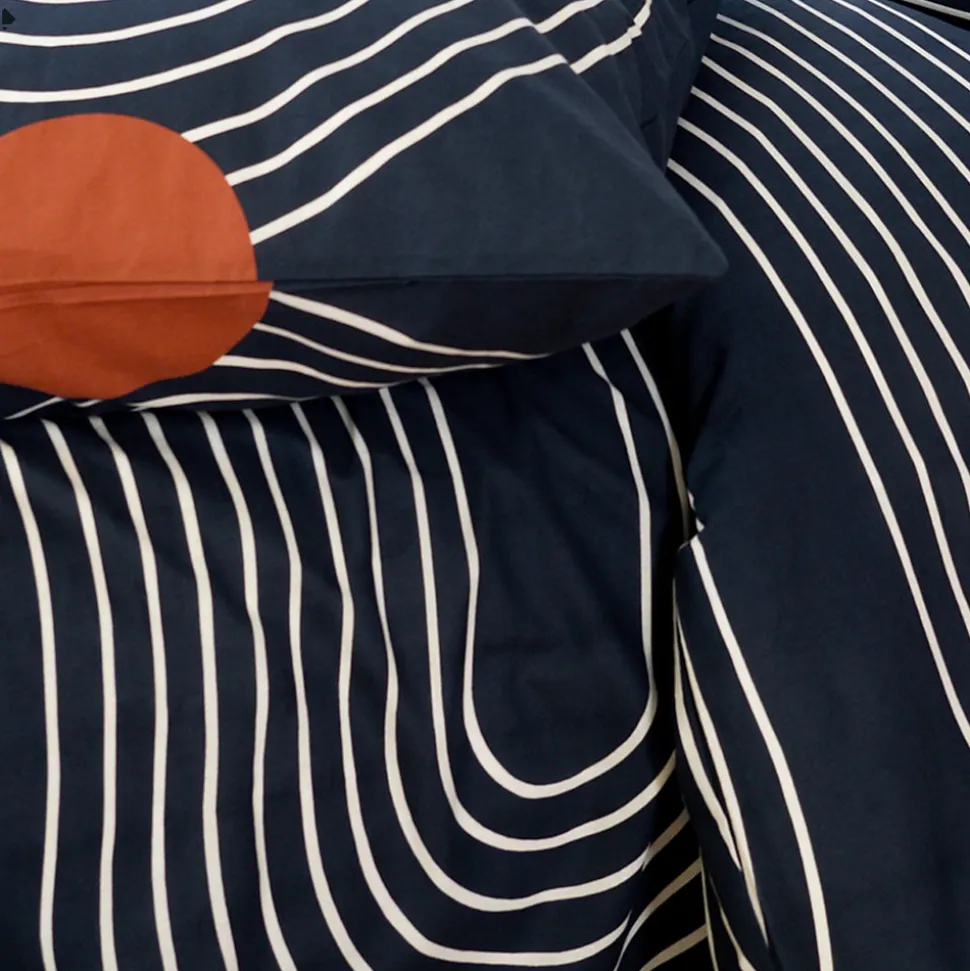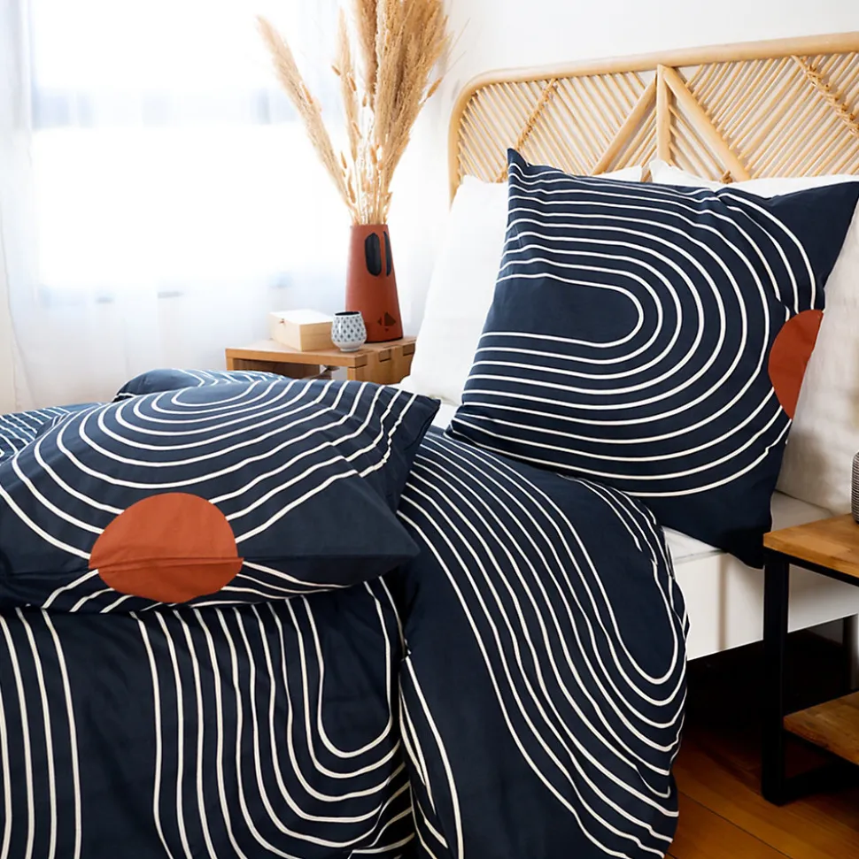 - Parure de lit en coton adouci parfaite pour un look hypnotique dans votre chambre avec un motif de grandes lignes blanches tout en courbe et de grand rond orange terracotta sur fond bleu nuit.