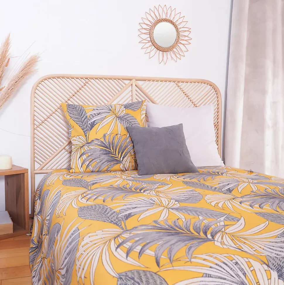 - Parure de lit en microfibre avec motif imprimé d’une composition de grandes feuilles dans des tons gris sur fond jaune.