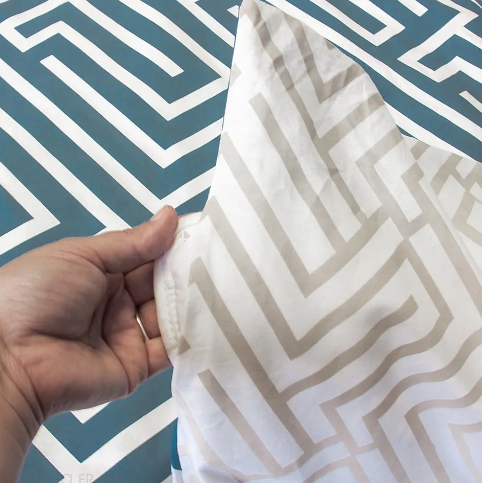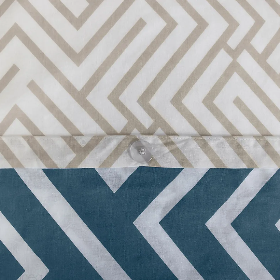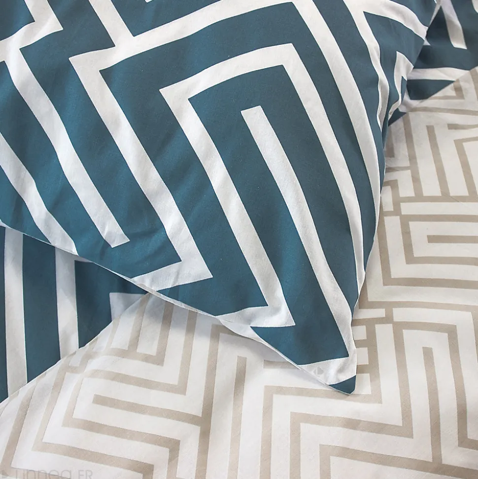 Parure de lit 240×220 cm pur coton PHOSY motif géométrique bleu 3 piècesDécouvrez la parure de lit PHOSY, où modernité et confort se rencontrent pour créer une atmosphère élégante dans votre chambre à coucher. Fabriquée à partir de pur coton certifié OEKO-TEX, cette parure vous assure une douceur inégalée et un sommeil réparateur, tout en respectant les normes économie circulaires les plus strictes.Le motif géométrique en forme de labyrinthe, avec ses lignes droites et angulaires, apporte une touche graphique et contemporaine à votre espace de repos. Réversible, la parure de lit PHOSY vous offre la possibilité de changer d’ambiance selon vos envies, en alternant entre deux designs harmonieux et stylés.Disponible en trois dimensions, cette parure s’adapte parfaitement à tous les lits pour un ajustement optimal et élégant. Que vous ayez un lit simple, double ou king size, vous trouverez la taille idéale pour sublimer votre chambre : 140×200 cm, 200×200 cm, et 240×220 cm.Optez pour la parure de lit PHOSY et transformez votre chambre en un havre de paix moderne et raffiné. Chaque nuit devient une expérience unique de confort et de style avec cette pièce essentielle de votre collection de linge de maison.Côté technique :Composition : 100% cotonMatière : CotonContexture : 52 fils/cm21 housse de couette avec finition sans rabat, fermeture boutons et passe-mains1 taies d’oreiller carrée 63×63 cm forme sac avec rabatMotif : GéométriqueFabriqué au Pakistan Les plus du produit :Coton apportant douceur et souplesseRéversibleCollection PHOSY disponible en parure de lit 240x220cm avec 2 taies d’oreillers 63x63cm, 260×240 avec 2 taies d’oreiller 63×63 cm et 140x200cm avec 1 taie d’oreiller 63x63cm.Linge de lit très résistant, doux et à petit prix Côt