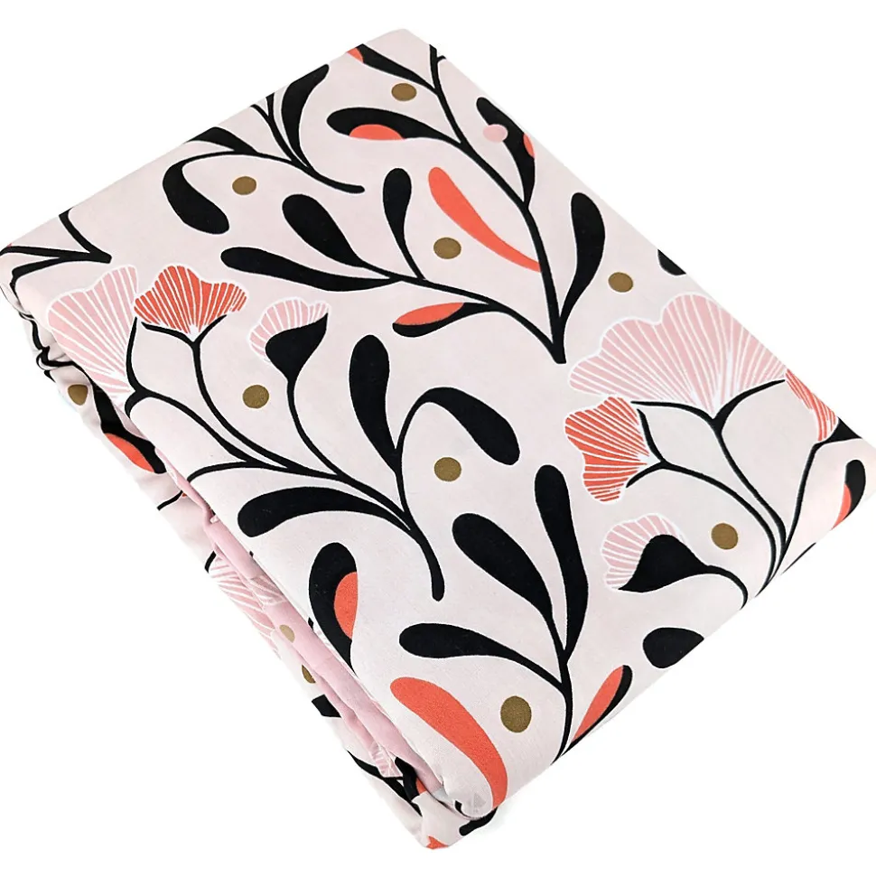 - Parure de lit en véritable satin de coton avec un motif de végétation composé de feuilles stylisées sur tiges noires avec de petits bourgeons roses et dorés sur un fond rose crème.