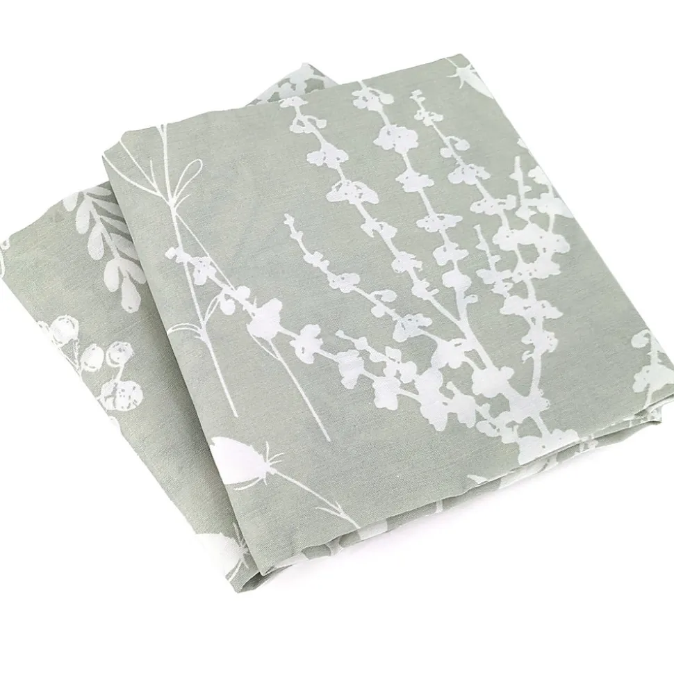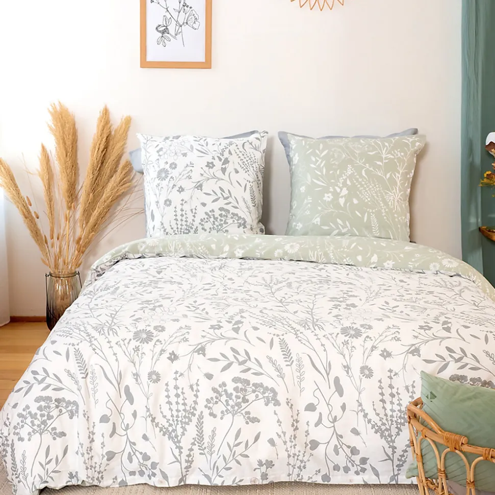 - Parure de lit en véritable satin de coton avec un motif de végétation printanière composées de brins de feuilles et fleurs colorés en blanc sur un fond vert pâle.