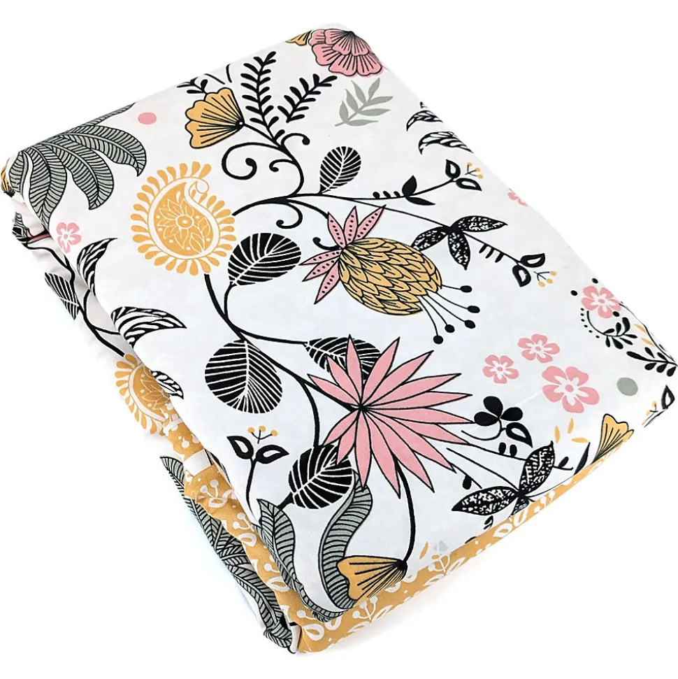 - Parure de lit en véritable satin de coton avec un motif all-over de végétation composé de feuilles et fleurs stylisées façon arabesques dans des coloris pastels sur un fond blanc.