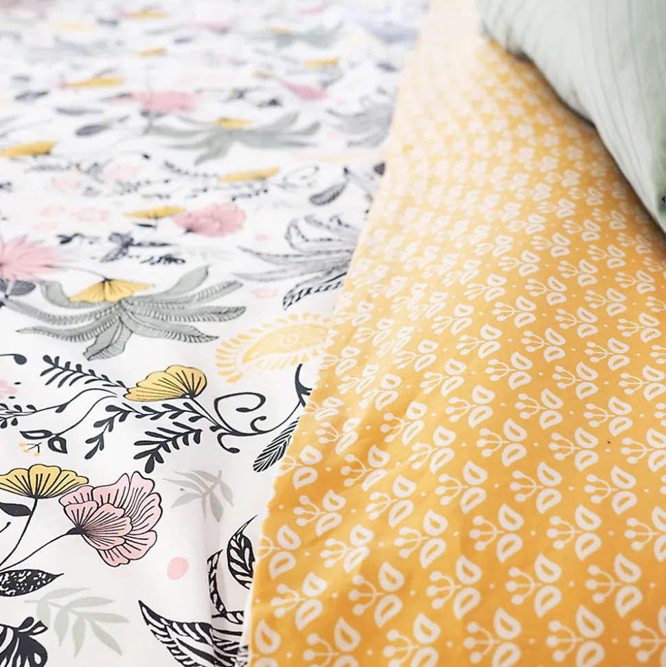 PARURE DE LIT WAYAN 240×220 CMParure de lit composée d’une housse de couette 240×220 cm et 2 taies 63×63 cmAmbiance estivale avec cette parure de lit imprimée d’une végétation avec des fleurs et feuilles stylisées façon arabesques dans des tons de rose, jaune et noir sur fond blanc. La collection linge de lit WAYAN en satin de coton est idéale pour une décoration qui donnera un look de prairie à votre chambre.Housse de couette avec une face imprimée d’un motif végétal all-over de fleurs et feuillers dans des tons jaune, rose et noir sur fond blanc, sur l’autre face all-over de petit motifs blanc sur fond jaune bourdon. Finition sans rabat aux pieds, fermeture par boutons, et passe-mains pour enfiler la couette facilement.Taie d’oreiller carrée avec deux faces imprimées différentes, motif coordonné avec la housse de couette. Finition simple, forme portefeuille avec un rabat intérieur.Côté technique :Matière : satin de coton issu de l’agriculture biologique GOTSQualité : coton 112 g/m2 78 fils/cm2Couleurs garanties grand teintHousse de couette 240×220 avec finition sans rabat, fermeture boutons et passe-mainsTaie d’oreiller carrée 63×63 cm forme portefeuille, avec grand rabat intérieur, finition simpleFabriqué au PakistanLes plus du produit :Qualité de tissu en satin de coton issu de l’agriculture biologique, et beau motifs imprimés pour ce linge de maison très qualitatif.Linge de lit certifié GOTS entièrement composés de coton issu de l’agriculture biologique et Standard 100 OEKO-TEX, pour des produits meilleurs pour votre santé.Différence entre percale de coton et satin de coton ? Le satin de coton est fabriqué à partir de fils de cotons très fins et avec un tissage ou chaque fil horizontal traverse trois fils (trame/chaine) et repasse dessous par la su