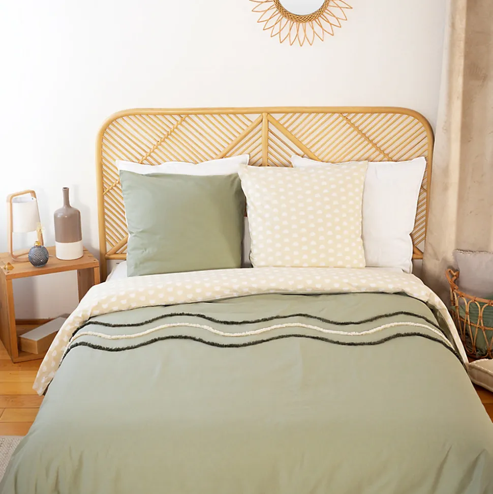 PARURE DE LIT LINEA 260×240 CMParure de lit imprimée composée d’une housse de couette 260×240 cm et 2 taies d’oreillers 63×63 cmAmbiance originale avec cette parure de lit 2 personnes réversible avec un motif tufté de lignes en formes de vagues.La collection linge de lit LINEA en coton est idéale pour une décoration de chambre atypique et moderne.Housse de couette reversible avec une face motif tufté de trois grandes lignes en forme de vague en partie haute dans des tons vert foncé et ivoire sur fond vert wasabi, sur l’autre face all-over de petit motif sur fond uni crème. Finition sans rabat aux pieds, fermeture par boutons, et passe-mains pour enfiler la couette facilement.Taie d’oreiller carrée avec une face uni vert wasabi et une face all-over blanc sur fond crème. Finition simple, forme portefeuille avec un rabat intérieur.Côté technique :Matière : Coton BCI adouci 57 fils/cm2Qualité : 110 g/m2Couleurs garanties grand teintHousse de couette 260×240 avec finition sans rabat, fermeture boutons et passe-mainsTaie d’oreiller carrée 63×63 cm forme portefeuille, avec grand rabat intérieur, finition simpleFabriqué au PakistanLes plus du produit :Originales, les parures tuftées 100% coton adouci s’adressent à ceux qui veulent mêler élégance et originalité. Des mèches de coton sont intégrées lors du tissage pour offrir un style unique qui ne se dégradera pas au fil des lavages.Parure de lit labellisé « BCI : Better Cotton » qui contribue à l’amélioration des méthodes de production du coton à l’échelle mondiale.Linge de lit certifié Standard 100 OEKO-TEX, pour des produits meilleurs pour votre santé. Côté pratique : Entretien facile, lavage en machine à 40°C, javel et clore interdit, séchage en sèche-linge à tempé