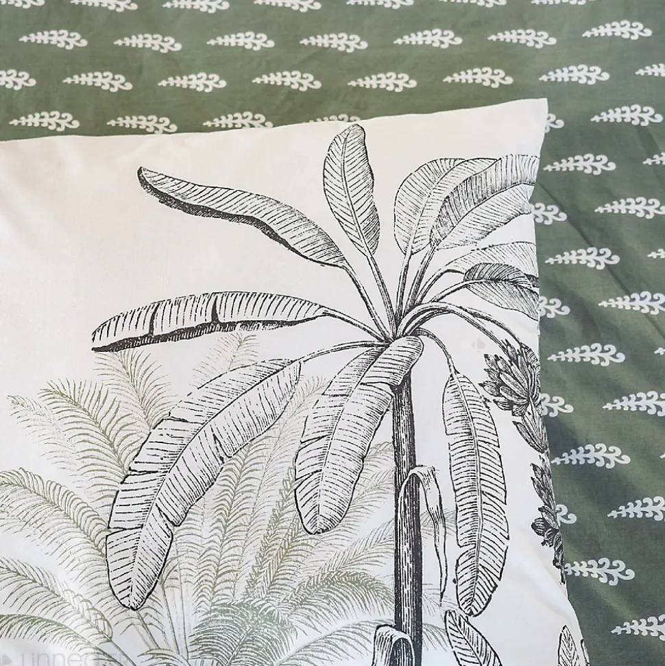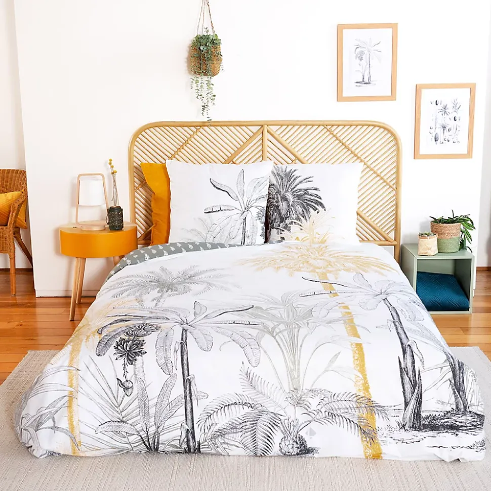 Parure de lit 260×240 cm coton SOLI vertCréez une ambiance chaleureuse au sein de votre chambre avec la parure de lit SOLI. Réversible, elle posséde une face avec un all-over de motifs géométriques sur fond vert. L’autre face posséde des motifs de palmiers, de cocotiers et d’arbres exotiques. De quoi apporter du soleil dans vos rêves ! En 100% coton BCI adouci, cette parure vous assurera également une grande souplesse et un toucher très doux.Côté technique :Matière : 100% coton BCI adouciGrammage : 115 g/m2Finition : Housse de couette sans rabat, fermeture boutons et passe-mains forme rectangulaireTaies d’oreillers carrées 63×63 cm forme sac avec rabatFabriqué au PakistanLes plus du produit :Belle qualité de coton pour une douceur inégaléeLinge de lit certifié Standard 100 OEKO-TEX, pour des produits meilleurs pour votre santé.Collection SOLI disponible en parures de lit 240×220 cm, 260×240 cm avec 2 taies d’oreillers 63×63 cmCôté pratique :Entretien facile : lavage en machine à 40°C; séchage en sèche-linge à température réduite; javel et chlore interditsConseils : Lavez votre linge avant la première utilisation; respectez toujours les conseils d’entretien figurant sur l’étiquette du produit; retournez les housses de couettes et les taies d’oreillers pour les laver sur l’envers.Symboles d’entretien :Cycle normal 40°CPas de blanchimentSéchage en tambour autorisé, température modérée 60°CRepasser à une température maximale de semelle de fer de 110°CPas d'entretien professionnel à sec